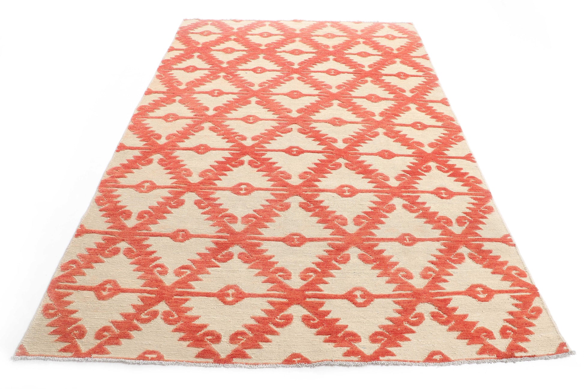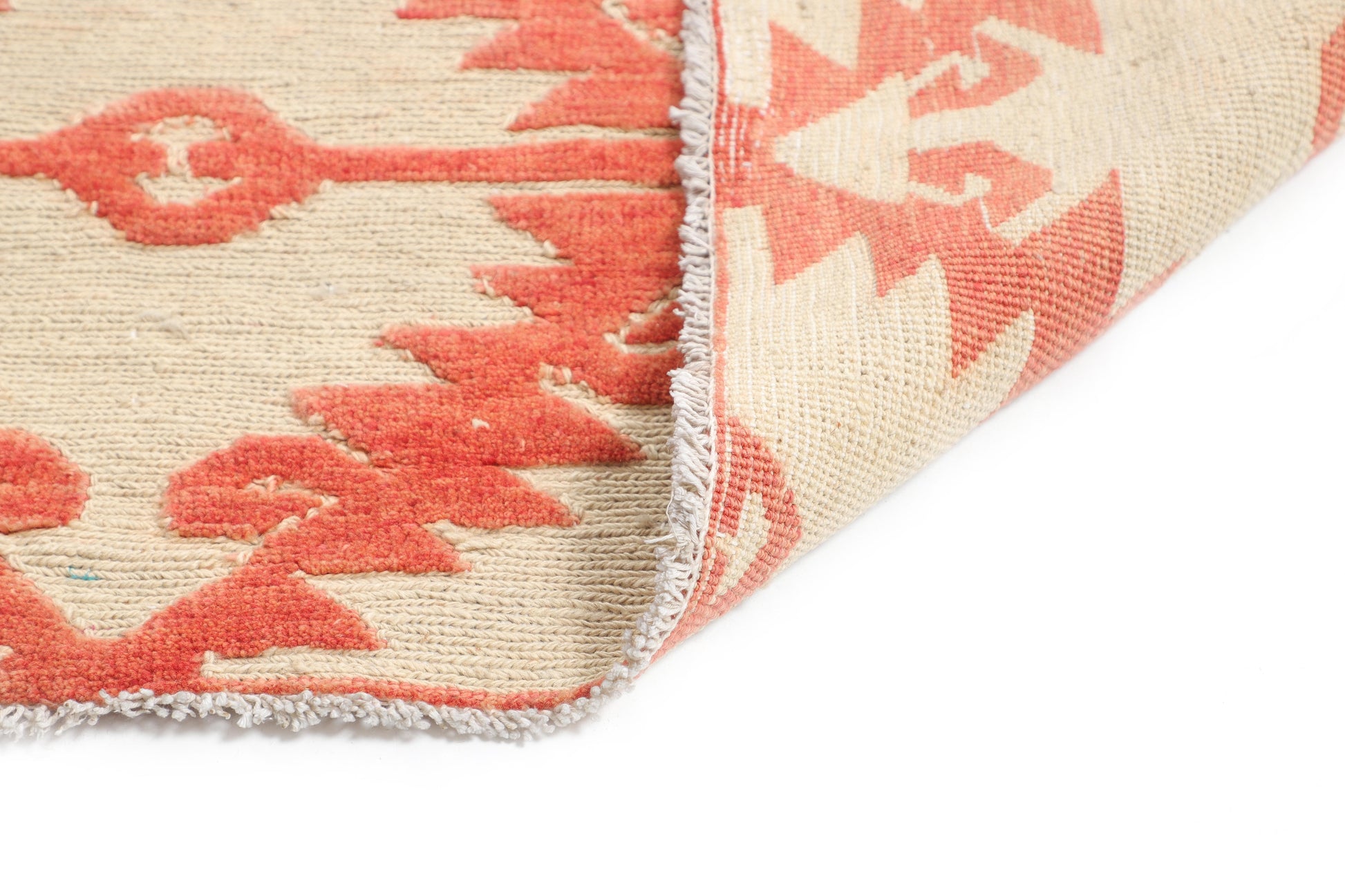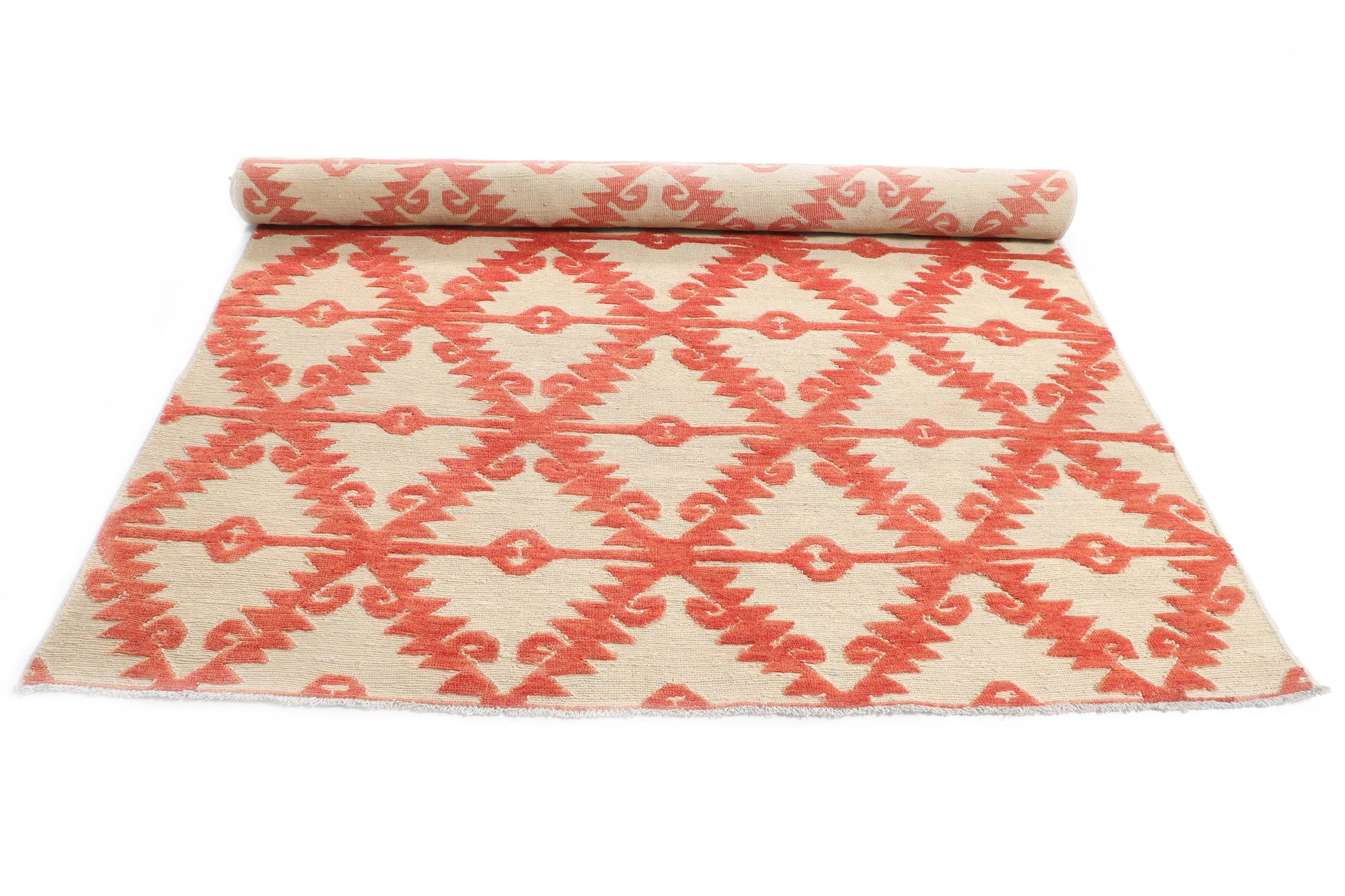 This hand-knotted wool rug from Pakistan showcases a vibrant, traditional design with a modern twist. The pattern features an all-over geometric motif of interlocking diamond and zigzag shapes in a lively reddish-orange, set against a creamy off-white field. This durable piece is a versatile foundation that adds a warm and intricate element to any room.