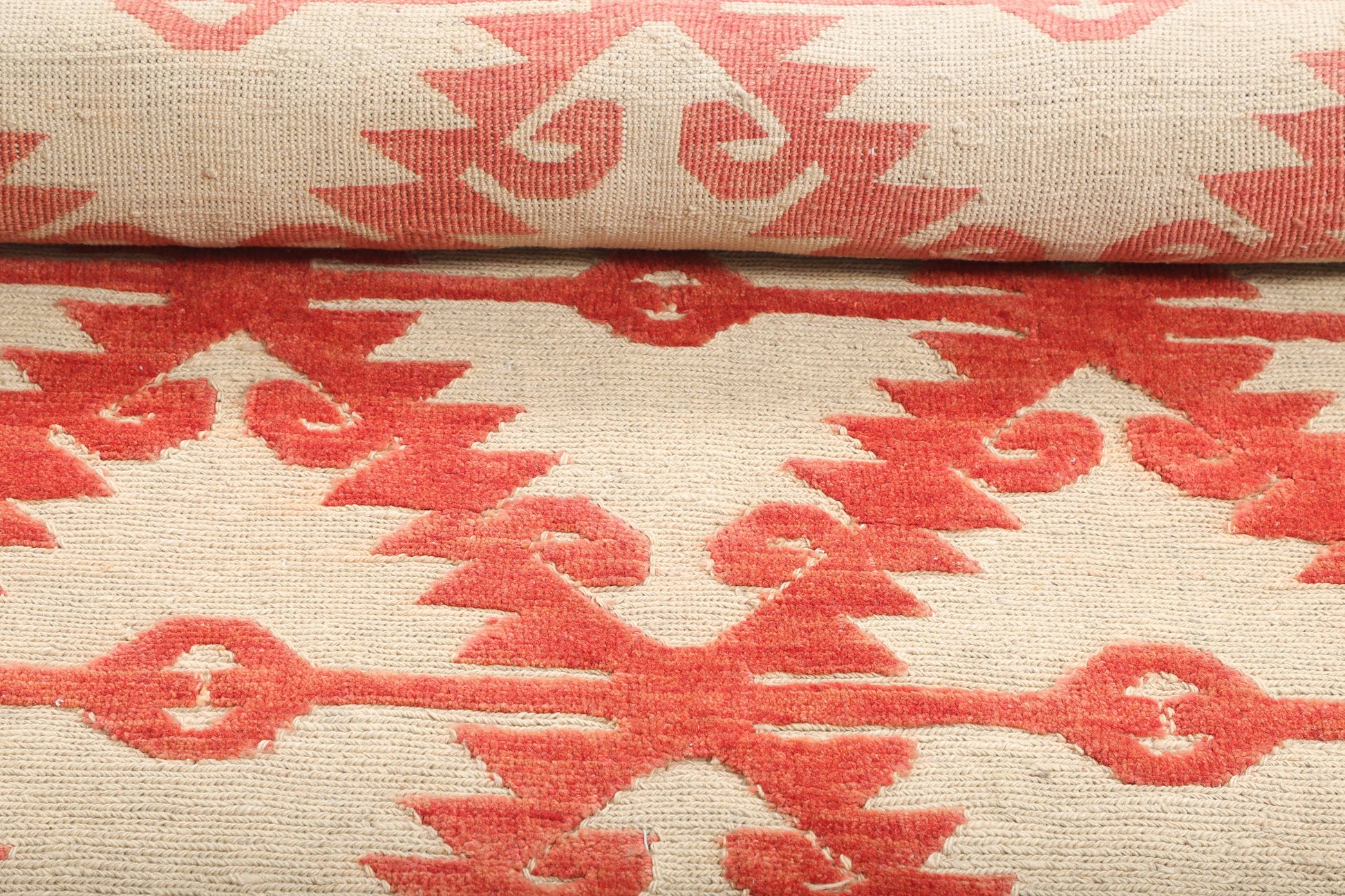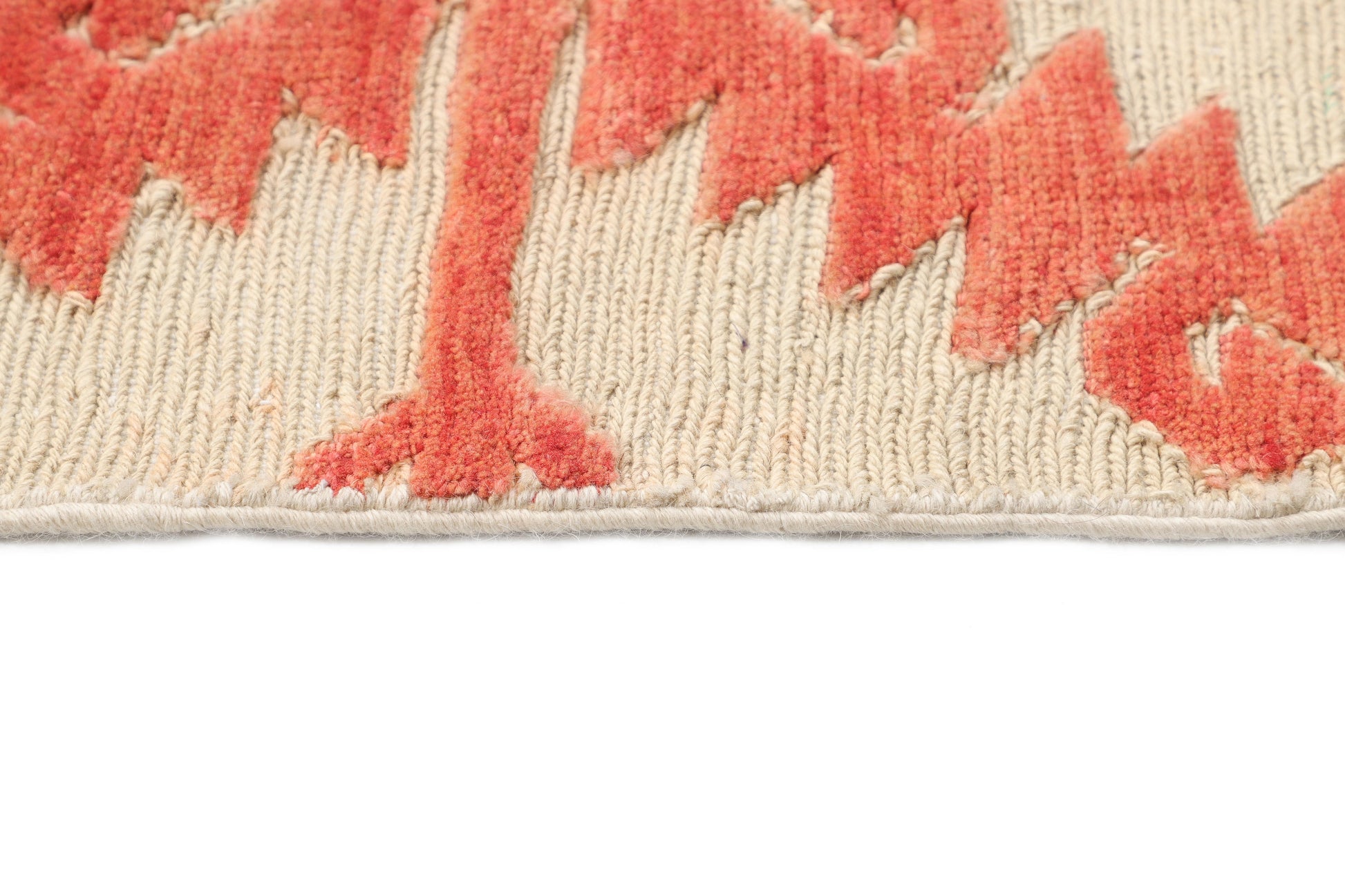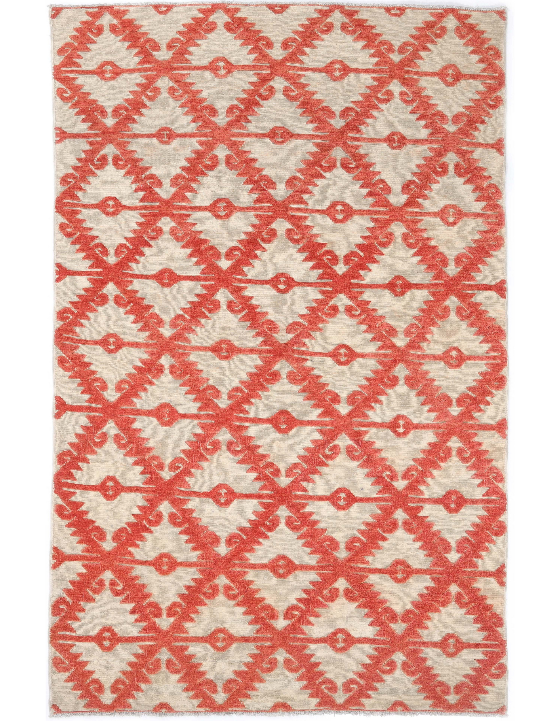 This hand-knotted wool rug from Pakistan showcases a vibrant, traditional design with a modern twist. The pattern features an all-over geometric motif of interlocking diamond and zigzag shapes in a lively reddish-orange, set against a creamy off-white field. This durable piece is a versatile foundation that adds a warm and intricate element to any room.