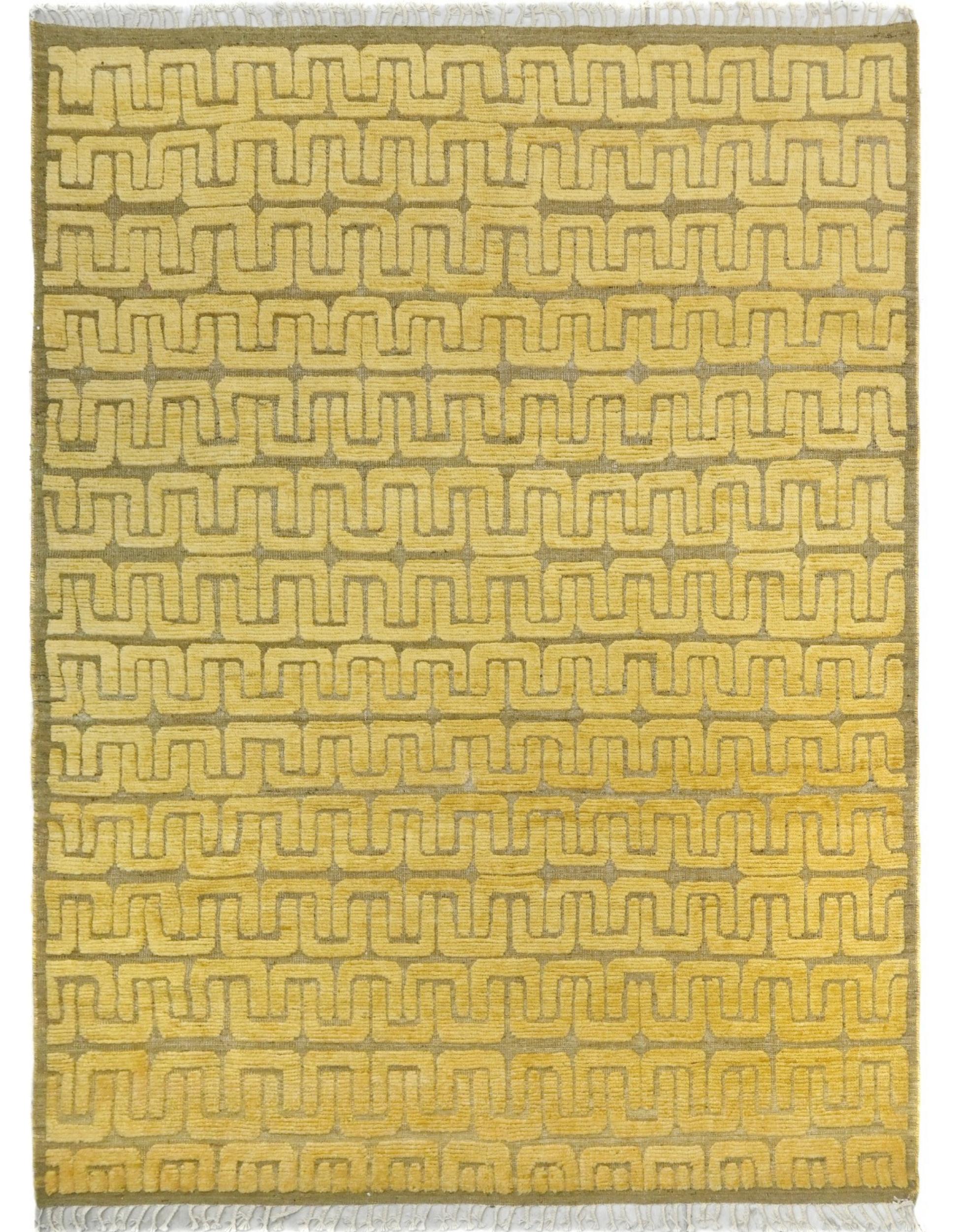 This hand-knotted wool rug from Pakistan features a modern, all-over pattern with a rich texture. It displays a dense, repeating geometric motif of interlocking U-shaped links in a muted yellow against a gray field, creating a sophisticated, tonal design. The entire rug has a subtly distressed look, giving it a soft, worn-in feel. This durable piece is a versatile foundation for a variety of decor styles.