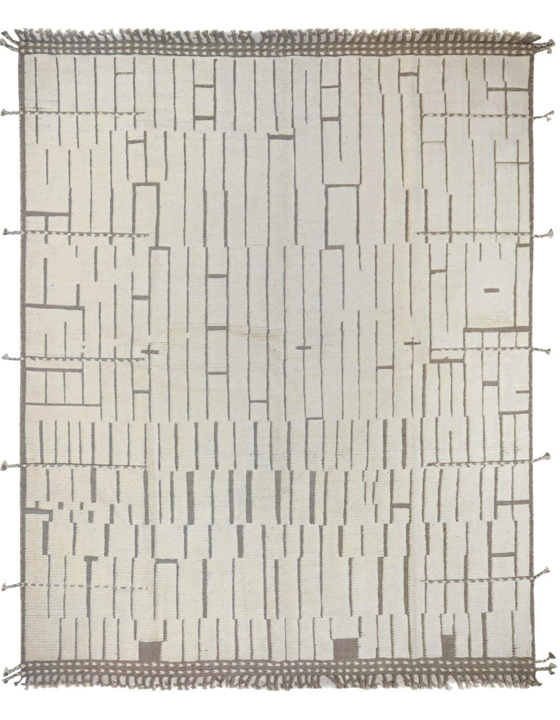 This hand-knotted wool rug from Pakistan features a modern, all-over pattern with a rich texture. It displays a dense, repeating abstract pattern of vertical and horizontal bars in light gray against a solid off-white field. The design creates a unique and striking visual effect, reminiscent of a cityscape or a minimalist grid. This durable piece is a versatile foundation for a variety of contemporary and transitional decor styles.