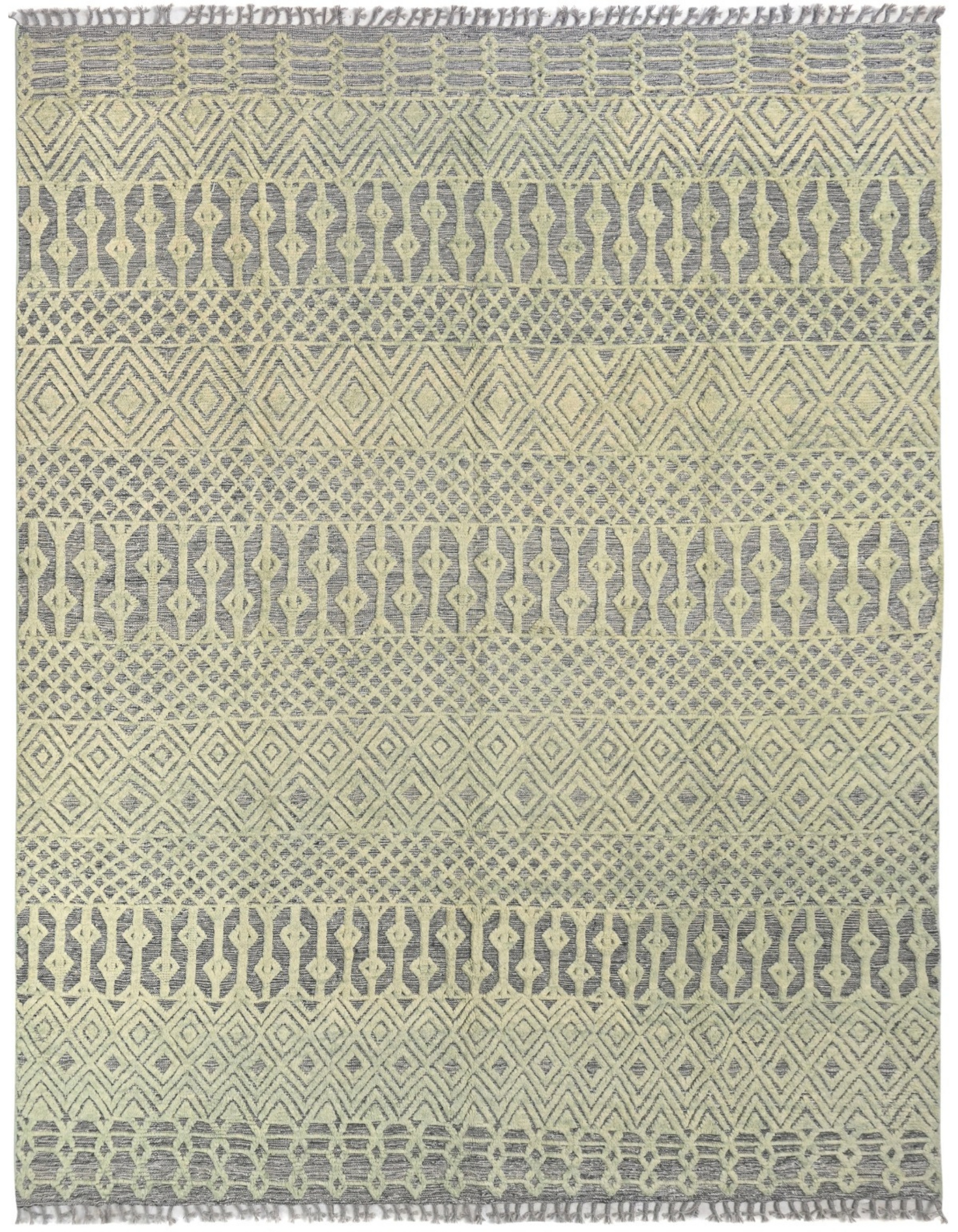 This hand-knotted wool rug from Pakistan features a modern, all-over pattern with a rich texture. It displays a dense, repeating abstract pattern of diamond shapes and interconnected vertical motifs in a light yellow against a dark gray field. The design creates a unique and striking visual effect, reminiscent of a tribal or folk art design. This durable piece is a versatile foundation for a variety of contemporary and transitional decor styles.