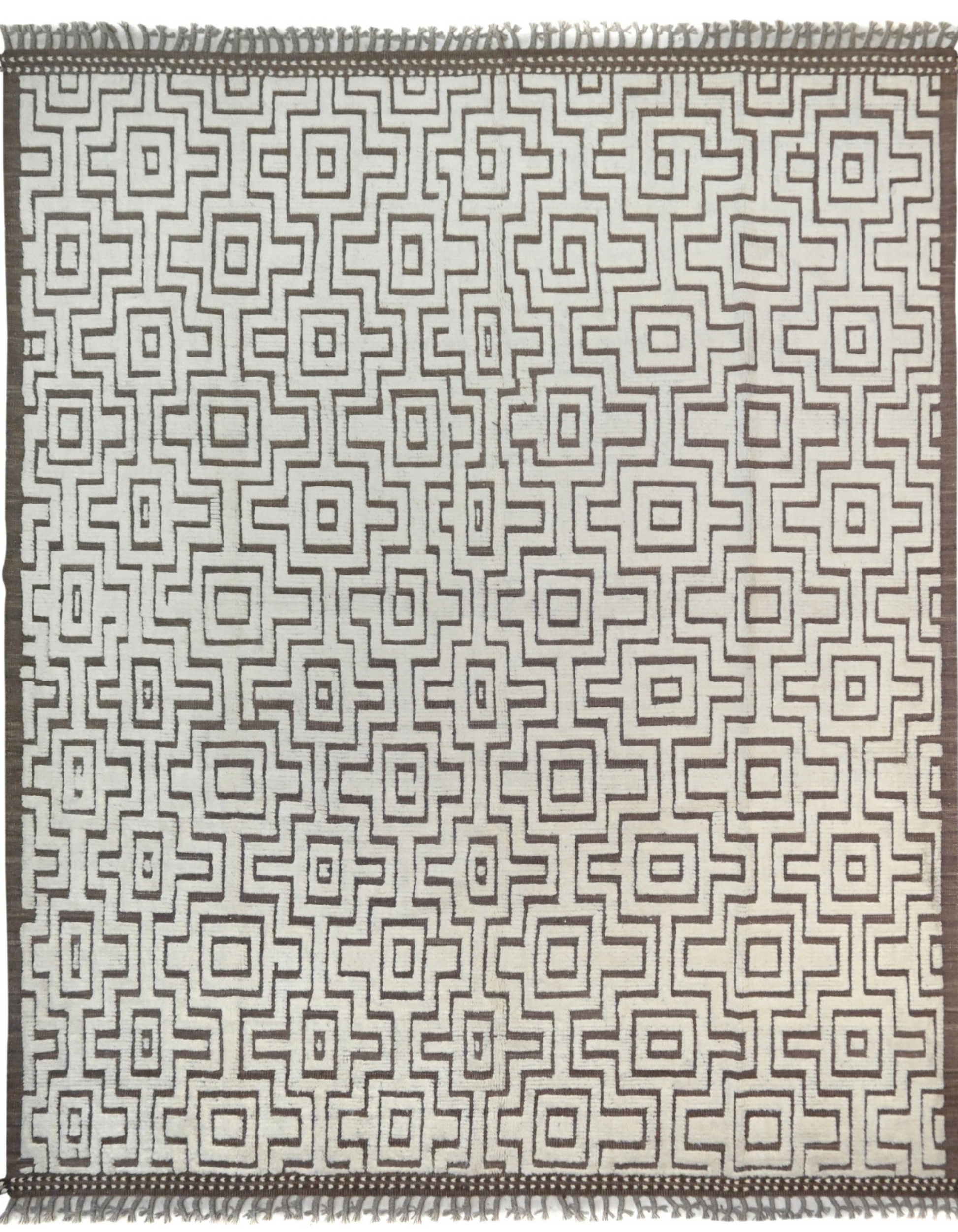 This hand-knotted wool rug from Pakistan features a modern, all-over pattern with a rich texture. It displays a dense, repeating labyrinth or maze motif in a light brown, creating a sophisticated, tonal design. The entire rug has a subtly distressed look, giving it a soft, worn-in feel. This durable piece is a versatile foundation for a variety of decor styles.