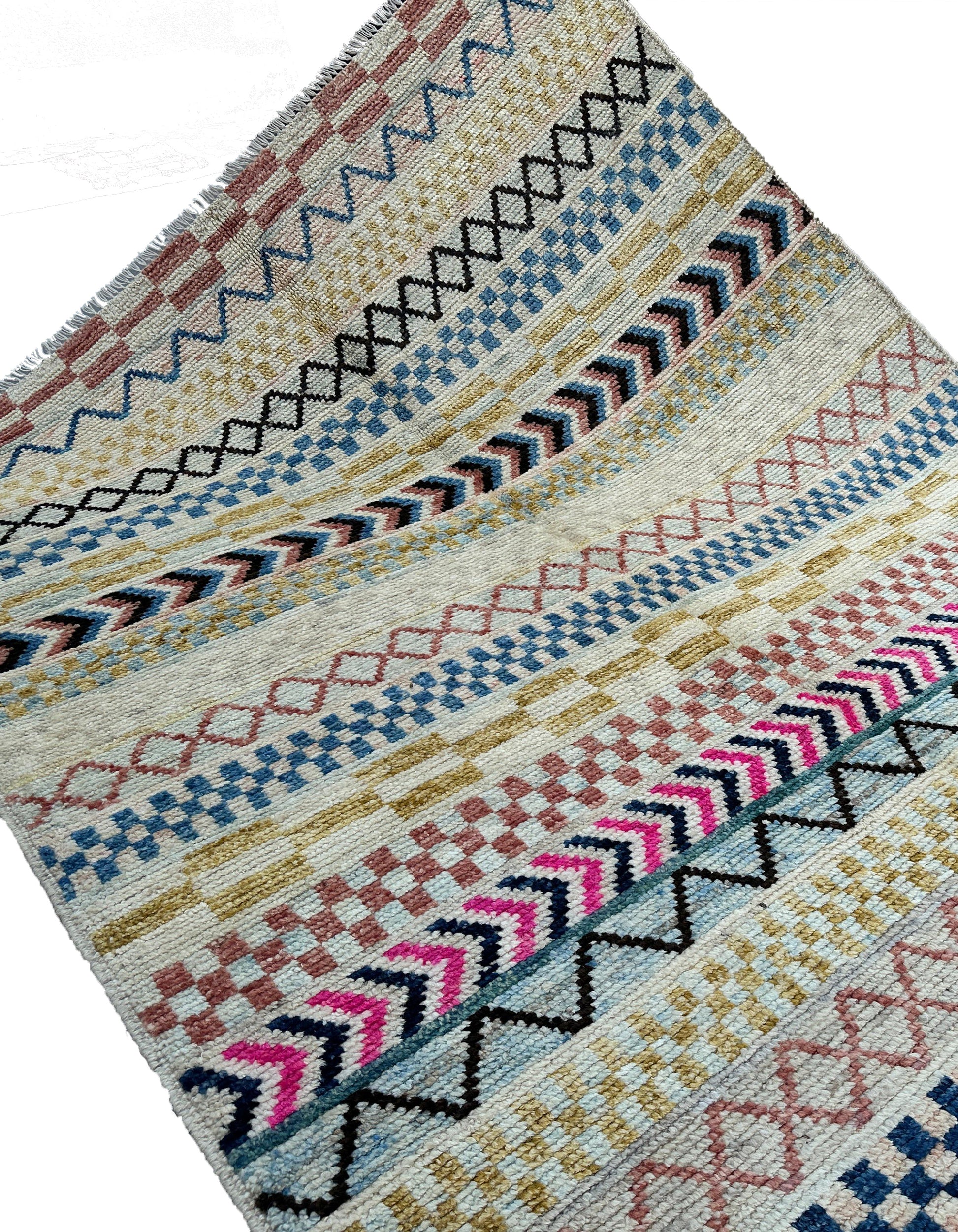 This hand-knotted wool rug from Pakistan offers a modern and artistic design with a lively, bohemian feel. It features a rich tapestry of geometric patterns, including chevron, diamond, and checkered motifs, in a dynamic and vibrant color palette. The rug combines off-white, light brown, pink, blue, and black tones to create a piece that is both sophisticated and playful. This textural and durable rug is a versatile addition that adds a pop of color and artistic flair to any space.