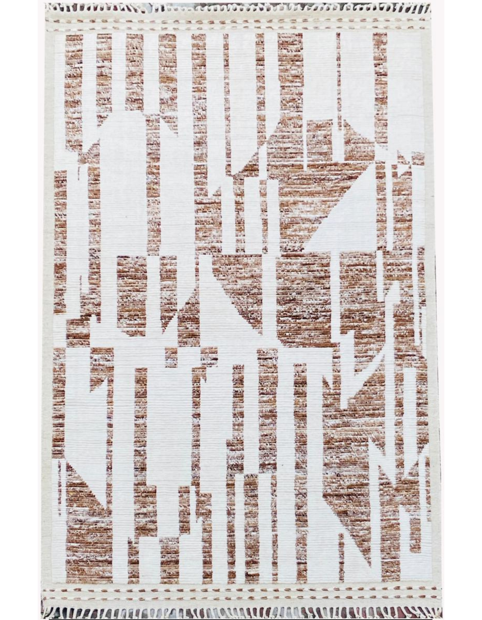 This hand-knotted wool rug from Pakistan features a modern, abstract geometric design. The pattern is created with a series of white shapes, including vertical stripes and large triangular motifs, that create a striking contrast against a textured brown field. The design creates a unique and striking visual effect, reminiscent of a cityscape or a deconstructed puzzle. This durable piece is a versatile foundation for a variety of contemporary and transitional decor styles.