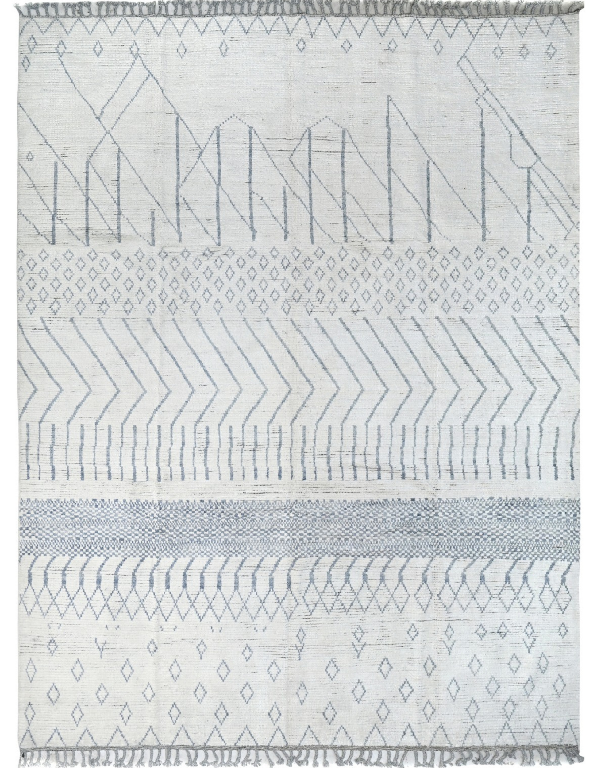 This hand-knotted wool rug from Pakistan offers an intricate, modern design. A series of horizontal bands in light gray/blue showcase a mix of different geometric motifs, including diamonds, chevrons, and textured lines, all set against a clean off-white background. This piece is a testament to fine craftsmanship and adds a sophisticated, layered look to your space.