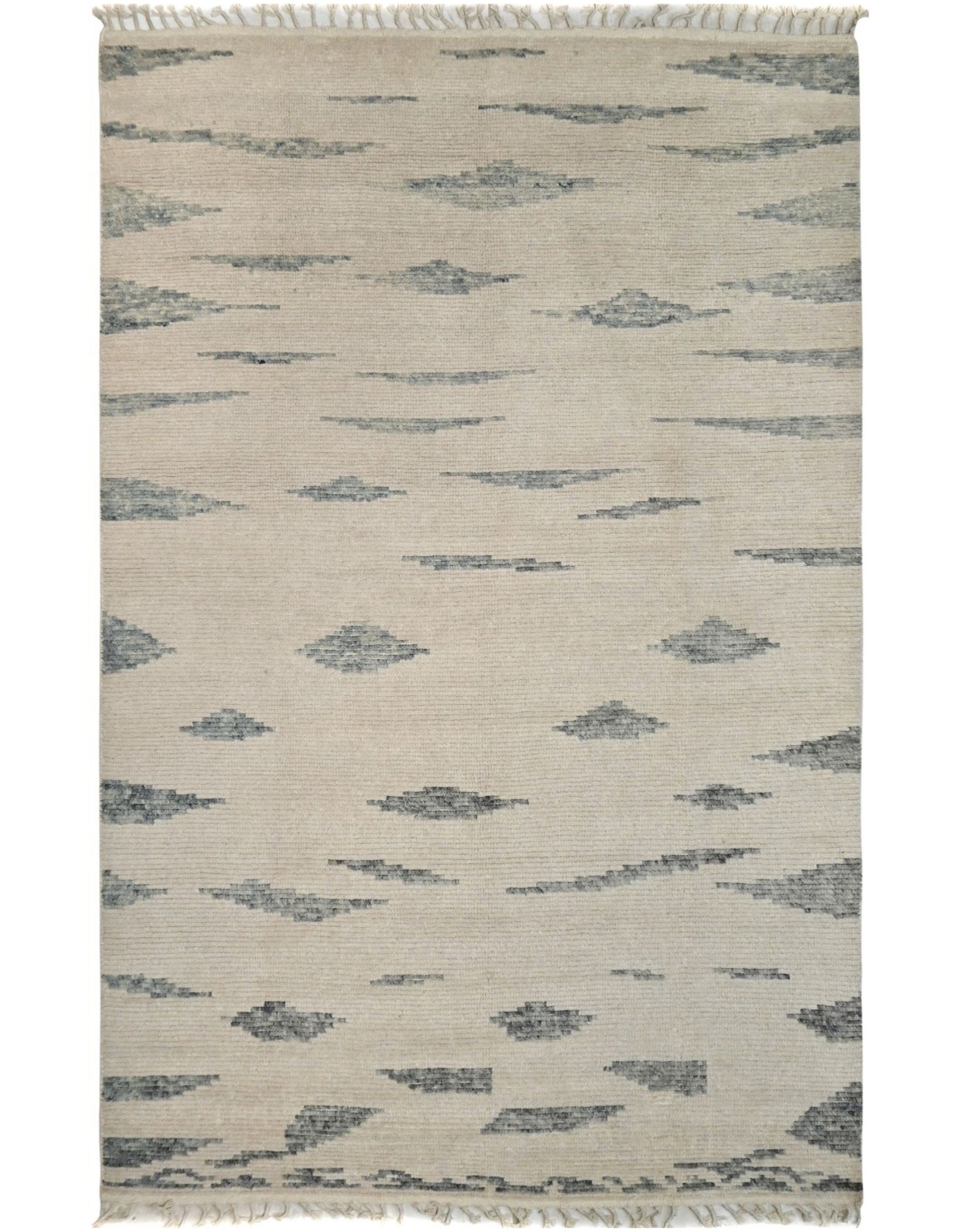 This hand-knotted wool rug from Pakistan features a modern, abstract pattern that resembles floating clouds or islands. The motifs are created with a series of textured gray shapes of various sizes, which are arranged in an all-over pattern over a textured off-white field. This simple yet striking design creates a sense of movement and depth. This durable piece is a versatile foundation that adds a modern and artistic element to any room.