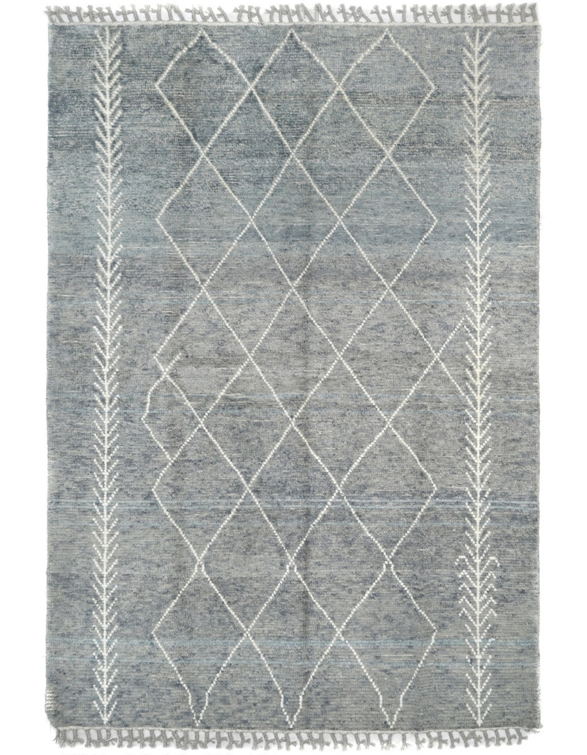 This hand-knotted wool rug from Pakistan features a modern, geometric trellis and tribal-inspired design. The rug's textured blue-gray field is adorned with a large, repeating diamond trellis pattern in off-white. Two vertical tribal motifs in off-white run along the sides of the rug, providing a unique border. This durable piece is a versatile foundation that adds a modern and eye-catching element to any room.