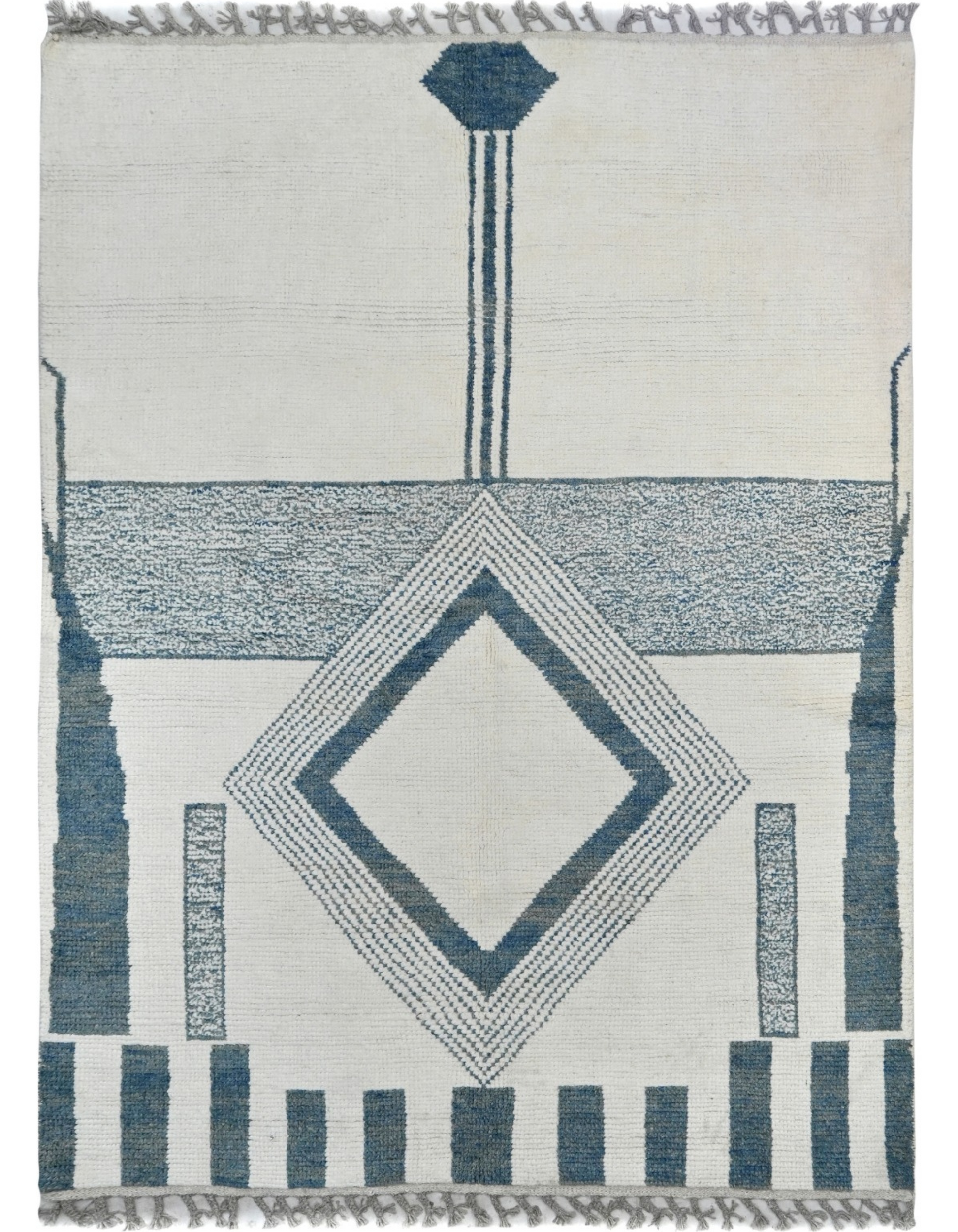 This hand-knotted wool rug from Pakistan features a modern, abstract geometric design. The pattern is created with a series of bold, blue-gray motifs against a textured off-white field. The design includes a large central diamond with a thin, dotted outline, flanked by vertical striped bands and horizontal bars. The top of the rug features a prominent dark blue shape with radiating lines, while the bottom is defined by thick horizontal stripes. This unique piece is a versatile foundation that adds a modern and eye-catching element to any room.