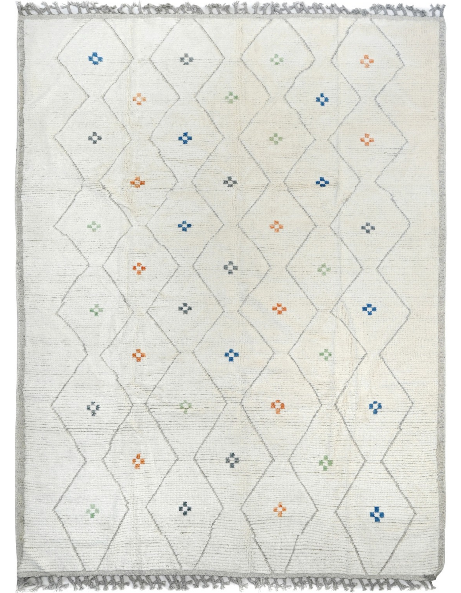 This hand-knotted wool rug from Pakistan features a modern, geometric trellis design. The pattern is created by a series of repeating, interconnected light gray diamonds that form a large-scale lattice over an off-white field. Small, multi-colored squares in shades of blue, orange, and green are woven into the center of each diamond, adding a unique and playful touch. This durable piece is a versatile foundation that adds a modern and eye-catching element to any