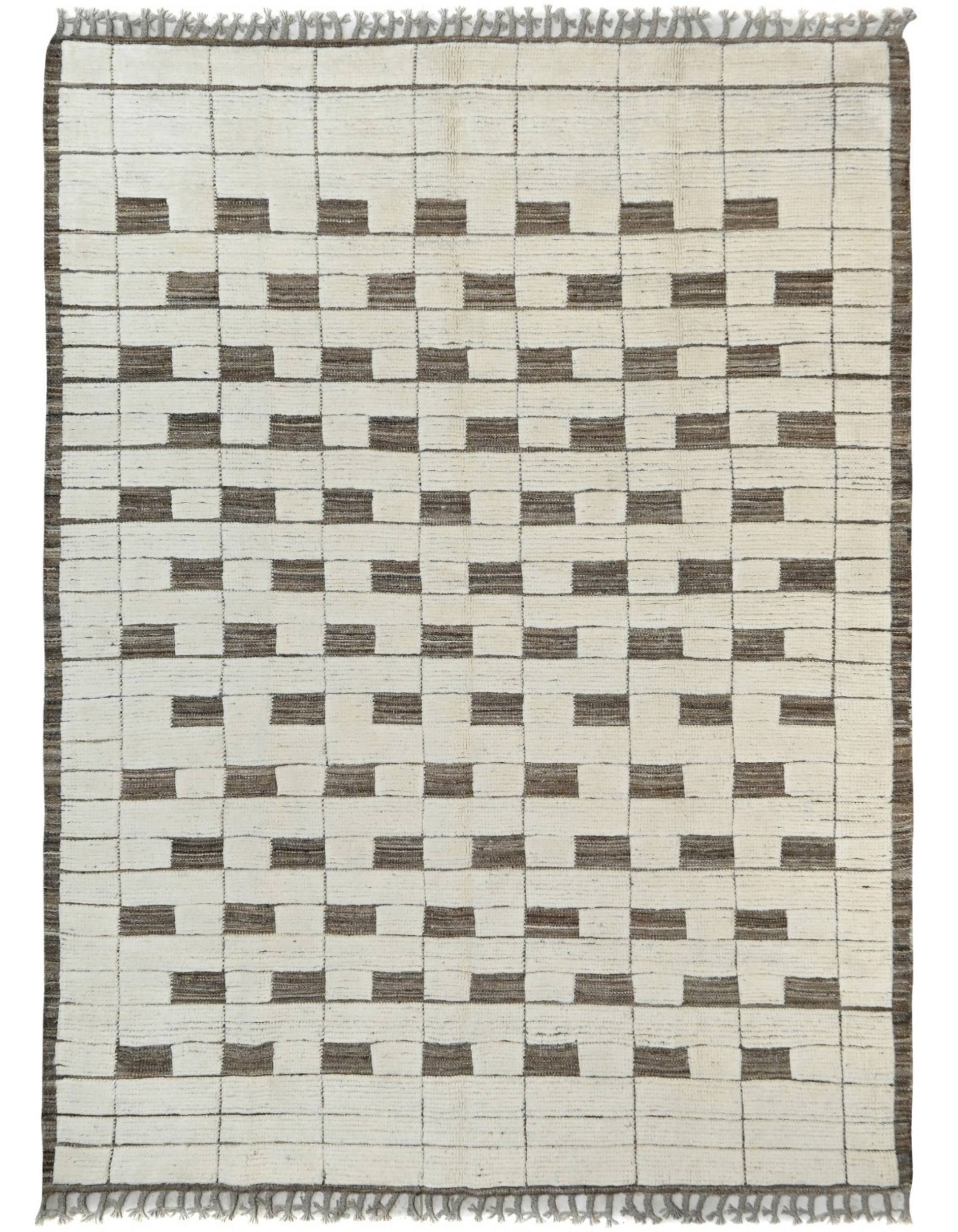 This hand-knotted wool rug from Pakistan features a modern geometric checkerboard design. The pattern is created with a grid of horizontal and vertical off-white lines, with a repeating pattern of solid brown blocks within the squares. The design creates a unique and striking visual effect, reminiscent of a classic puzzle. This durable piece is a versatile foundation for a variety of contemporary and transitional decor styles.