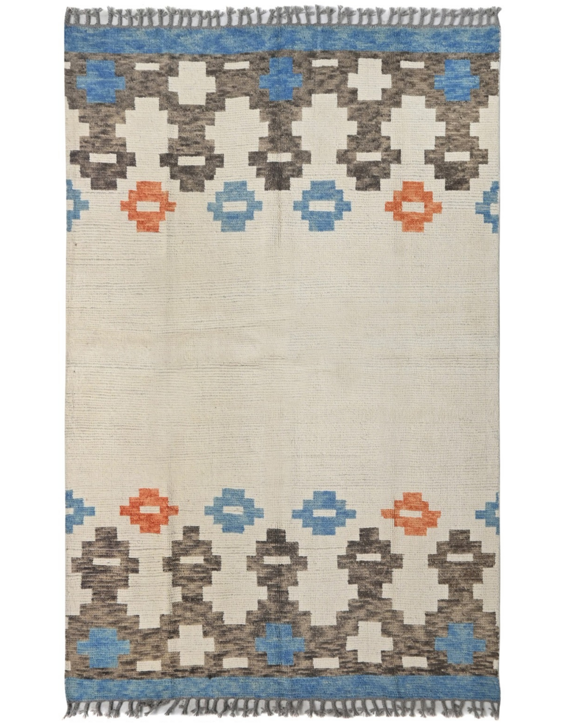 This hand-knotted wool rug from Pakistan features a modern, geometric design. The pattern is created with two horizontal bands of geometric motifs that are separated by a large off-white field. The motifs are in shades of blue, orange, and gray, adding a unique and playful touch to the design. This durable piece is a versatile foundation that adds a modern and eye-catching element to any room.
