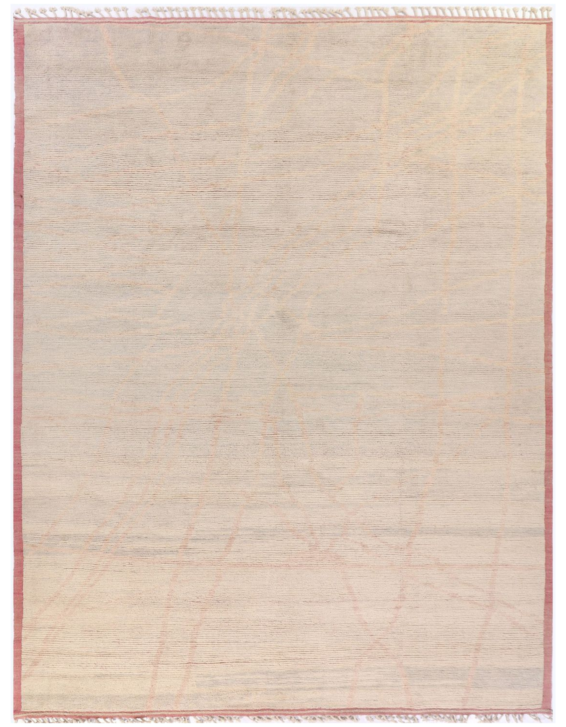 This hand-knotted wool rug from Pakistan offers a sophisticated, minimalist design. A subtle network of faint pink geometric lines is woven into a serene, off-white background, with a distinct pink border that frames the piece. Made from 100% premium wool, this rug is both soft to the touch and built for lasting durability.