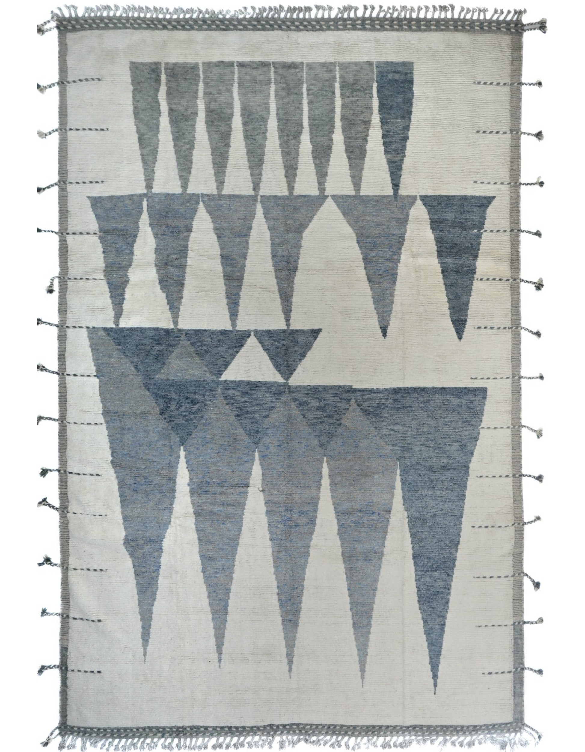This hand-knotted wool rug from Pakistan is a work of art with its bold, abstract design. It features a striking pattern of large triangular motifs that appear to cascade from the top and bottom in varying shades of gray and blue against a clean off-white background. This unique piece provides a dramatic and sophisticated focal point for any room.