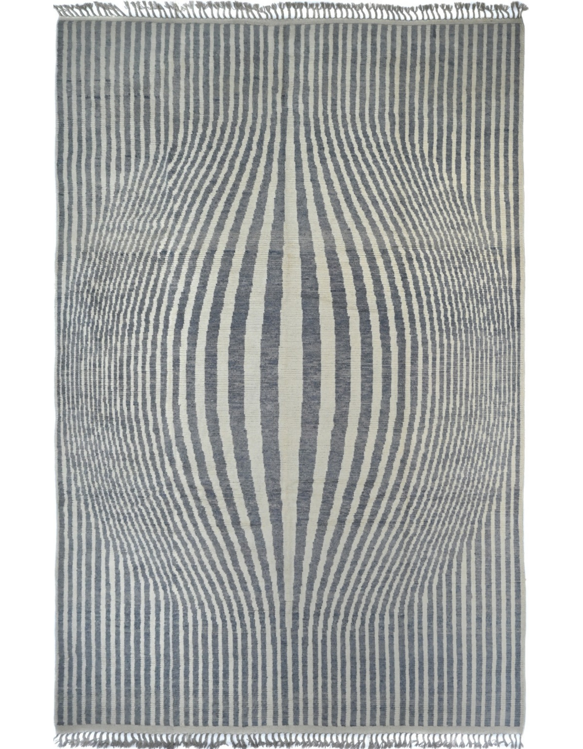This hand-knotted wool rug from Pakistan offers a stunning optical illusion. It features a modern design of vertical blue and off-white stripes that appear to warp and bulge outward from the center, creating a dynamic 3D effect. This piece is a work of art that provides both a durable foundation and an eye-catching focal point for your space.