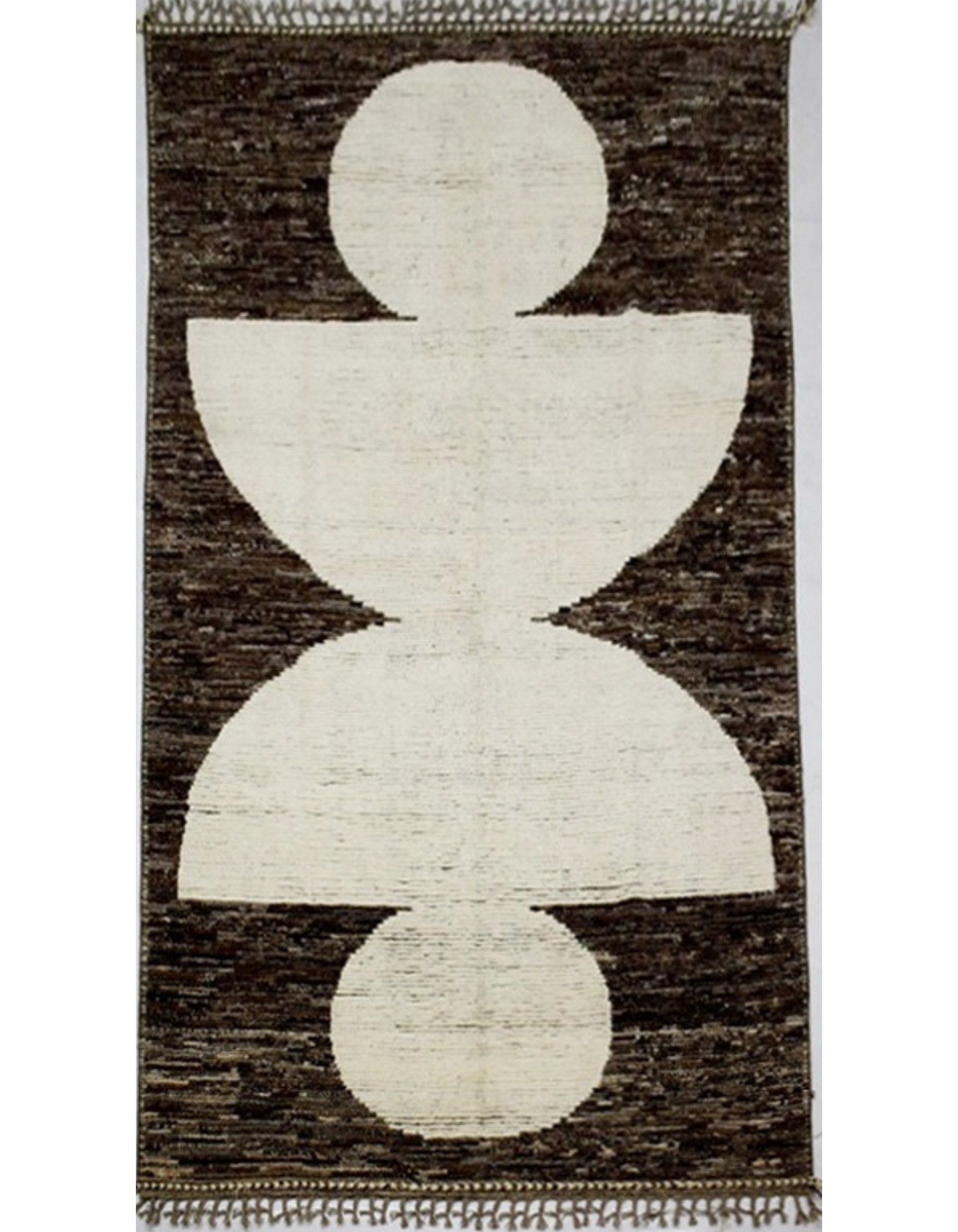This hand-knotted wool rug from Pakistan offers a bold, abstract design. It features large, geometric shapes—a mix of circles and semicircles—in a textured off-white against a rich, mottled dark brown background. This piece is a work of art that provides a striking focal point for your space.