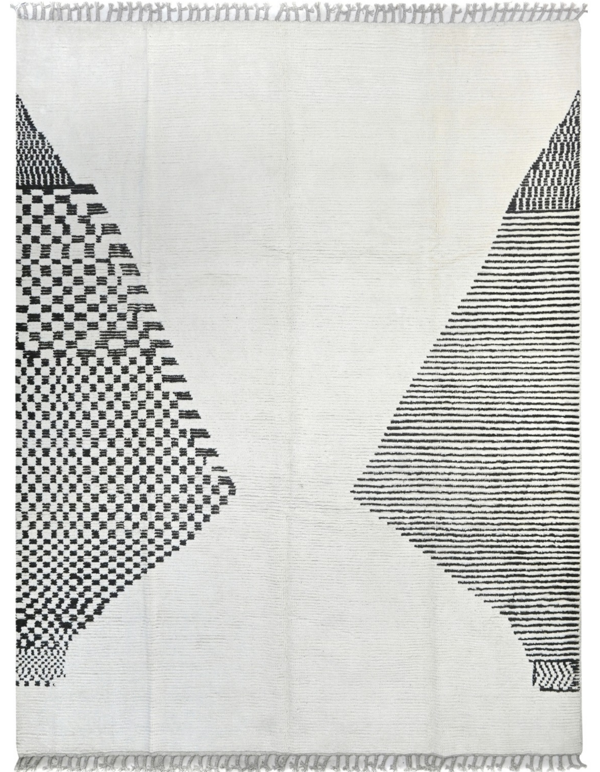 This hand-knotted wool rug from Pakistan offers a bold, graphic design. It features two large triangular motifs on either side of the rug's central field, each filled with contrasting patterns of checkerboard and stripes in black and off-white. This striking, art-inspired piece adds a strong visual statement to any space.