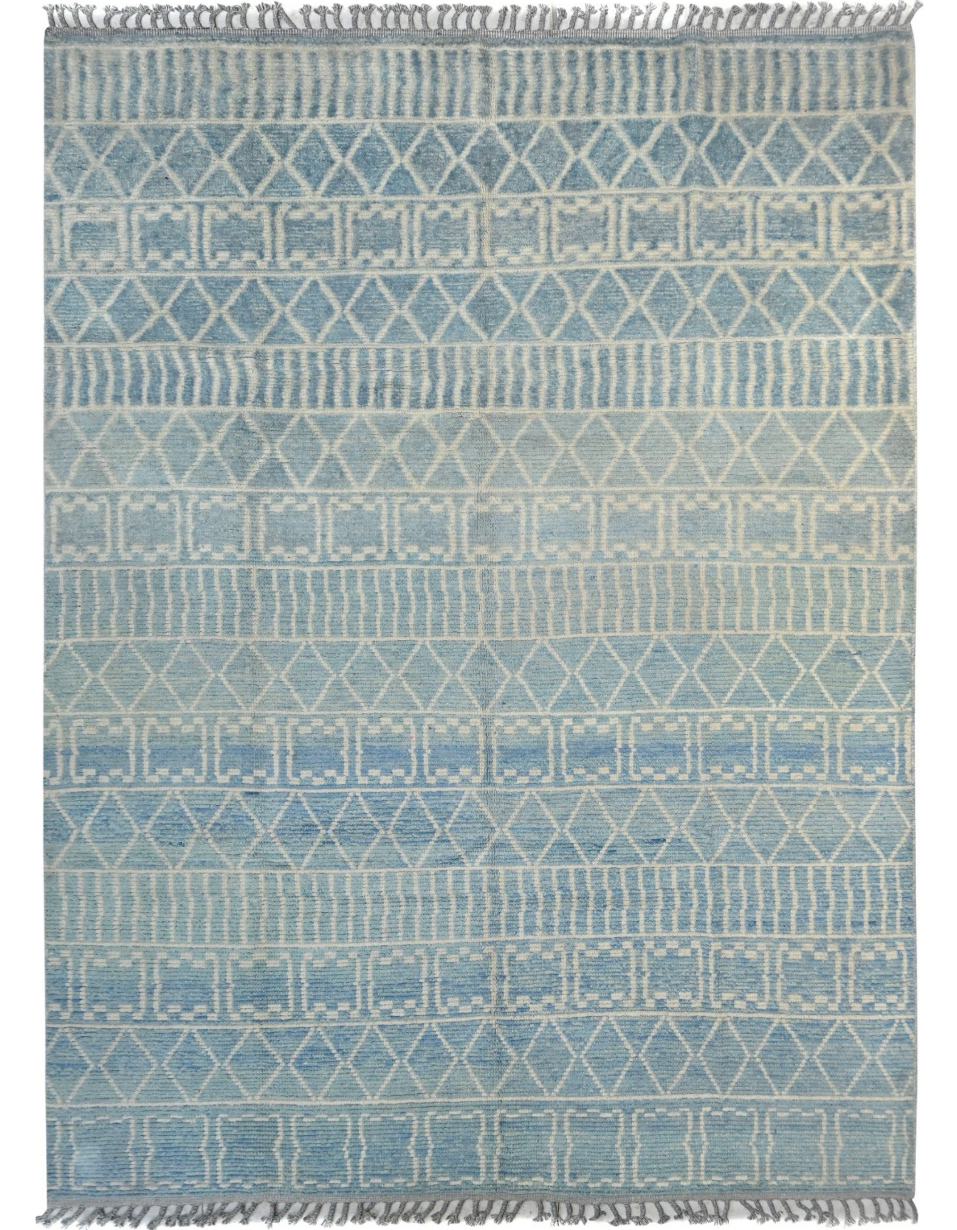 This hand-knotted wool rug from Pakistan brings a cool, layered design to your space. A series of vertical stripes and geometric shapes in different shades of blue and off-white creates a horizontal-banded effect. With its blend of intricate patterns and a serene color palette, this piece adds a refined touch and comfortable feel to any room.