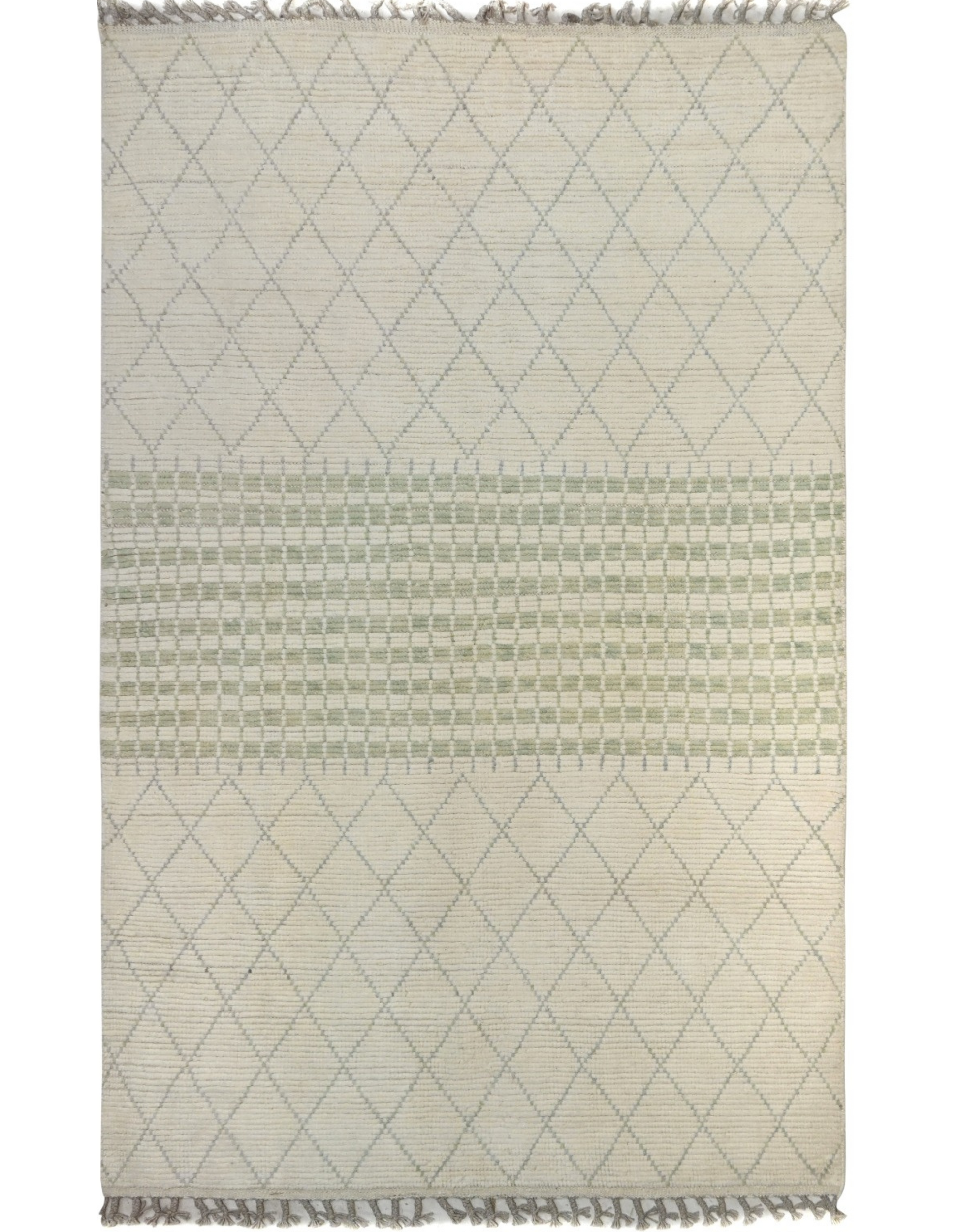 This hand-knotted wool rug from Pakistan offers a clean, modern design with a unique twist. A delicate trellis pattern in light gray/green is interrupted by a bold central band of muted green checkered squares. This piece is a versatile and durable addition that provides a sophisticated and layered look to your space.