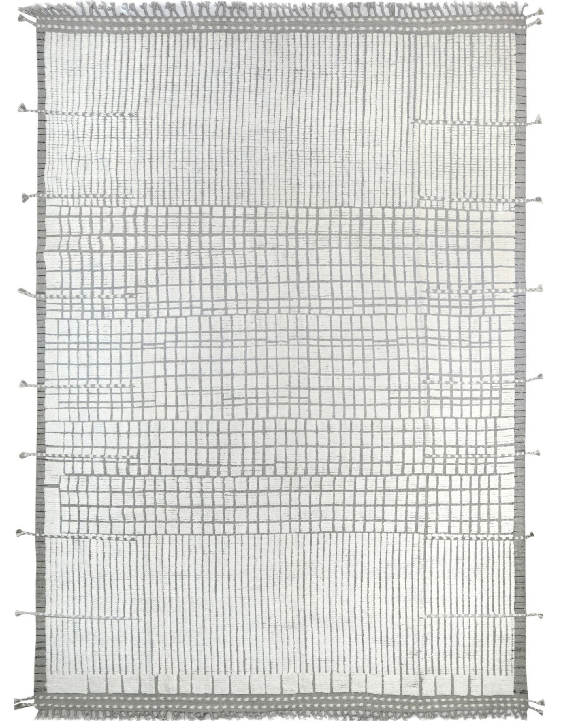 This hand-knotted wool rug from Pakistan offers a modern, rhythmic design. A series of fine, vertical light gray lines are intersected by bold horizontal bands, creating a unique, segmented grid-like pattern on a crisp off-white background. This piece adds a layer of quiet, architectural style and durable comfort to any space.