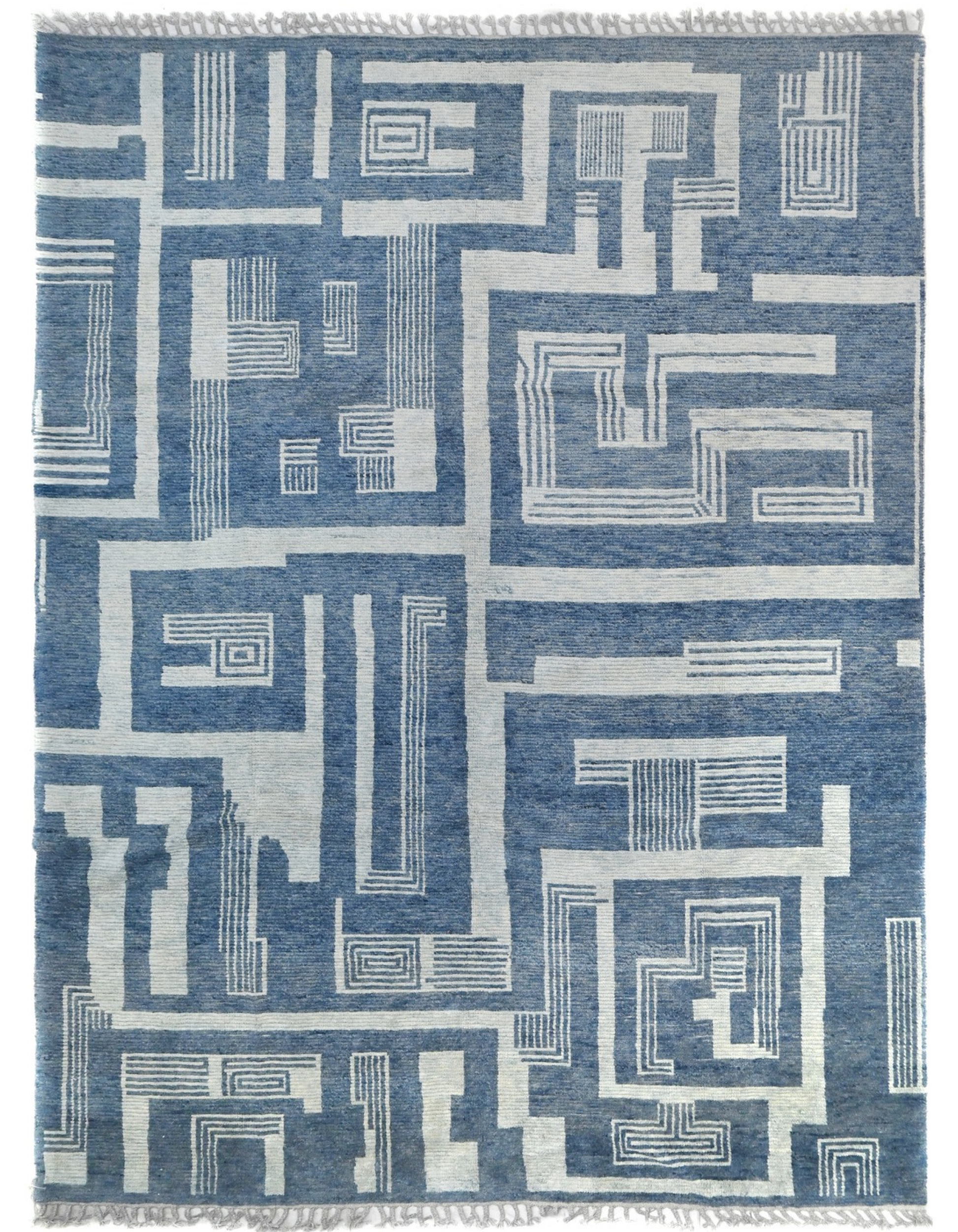 This hand-knotted wool rug from Pakistan brings an intricate, contemporary design to your space. A complex, abstract pattern of off-white lines and shapes creates a captivating, maze-like effect against a vibrant blue background. With its blend of artistic design and durable craftsmanship, this piece is made to be both a focal point and a lasting comfort.