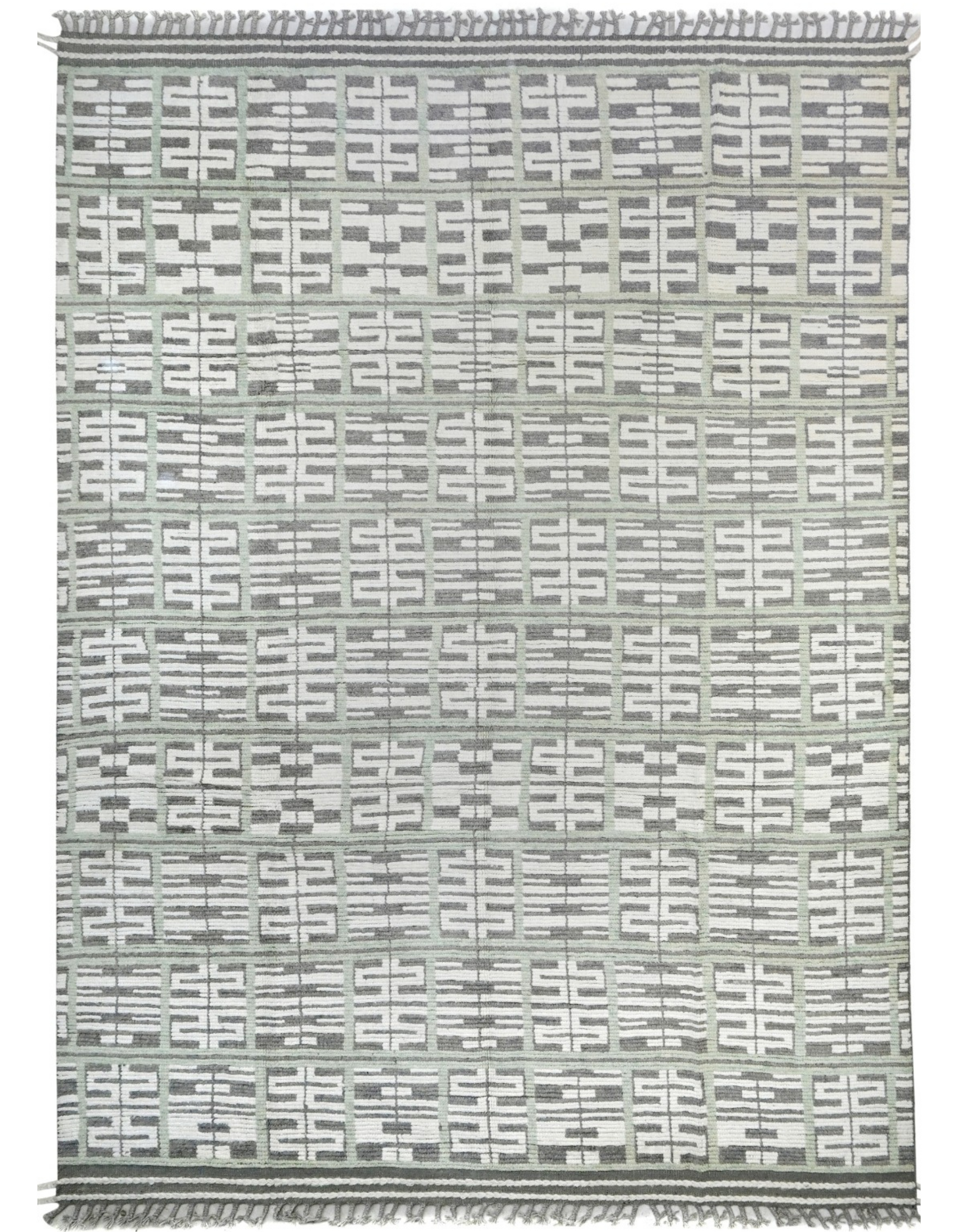 This hand-knotted wool rug from Pakistan offers a modern, balanced design. It features a series of horizontal bands with abstract, interlocking motifs in off-white and gray, all set against a calming backdrop of alternating gray and muted green. This piece adds a layer of subtle pattern and refined color to any space.