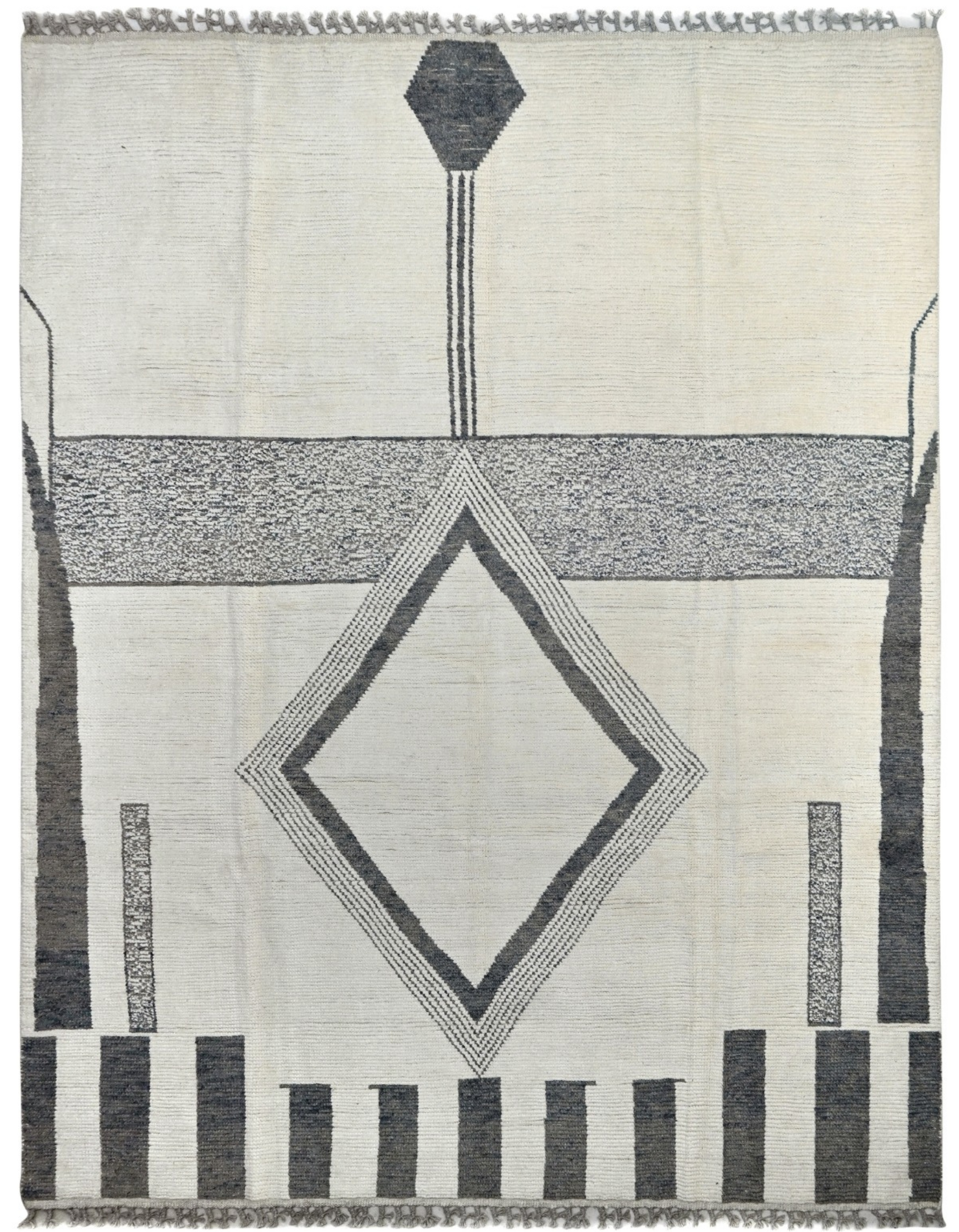 This hand-knotted Moroccan-inspired rug blends traditional craftsmanship with a modern aesthetic. Made by skilled artisans in Pakistan from 100% premium wool, this piece features a bold charcoal abstract pattern on a clean off-white background, creating a striking and contemporary look. It's a testament to both durable quality and timeless style.