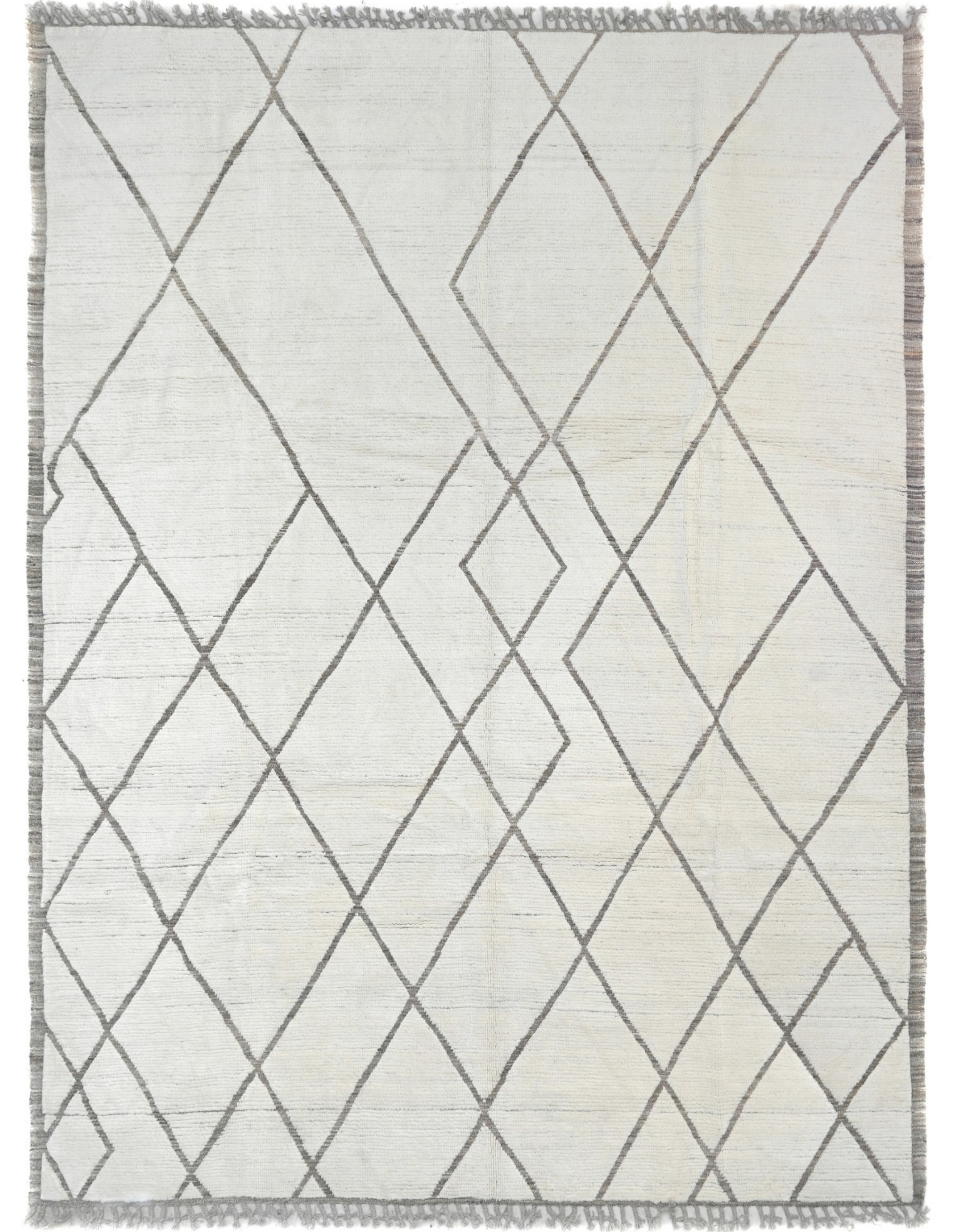 This hand-knotted wool rug from Pakistan offers a bold, minimalist take on a classic pattern. A large-scale charcoal diamond trellis covers the entire off-white background, creating a striking geometric design that commands attention while remaining elegantly simple. Made from 100% premium wool, this piece is both soft to the touch and built for lasting durability.