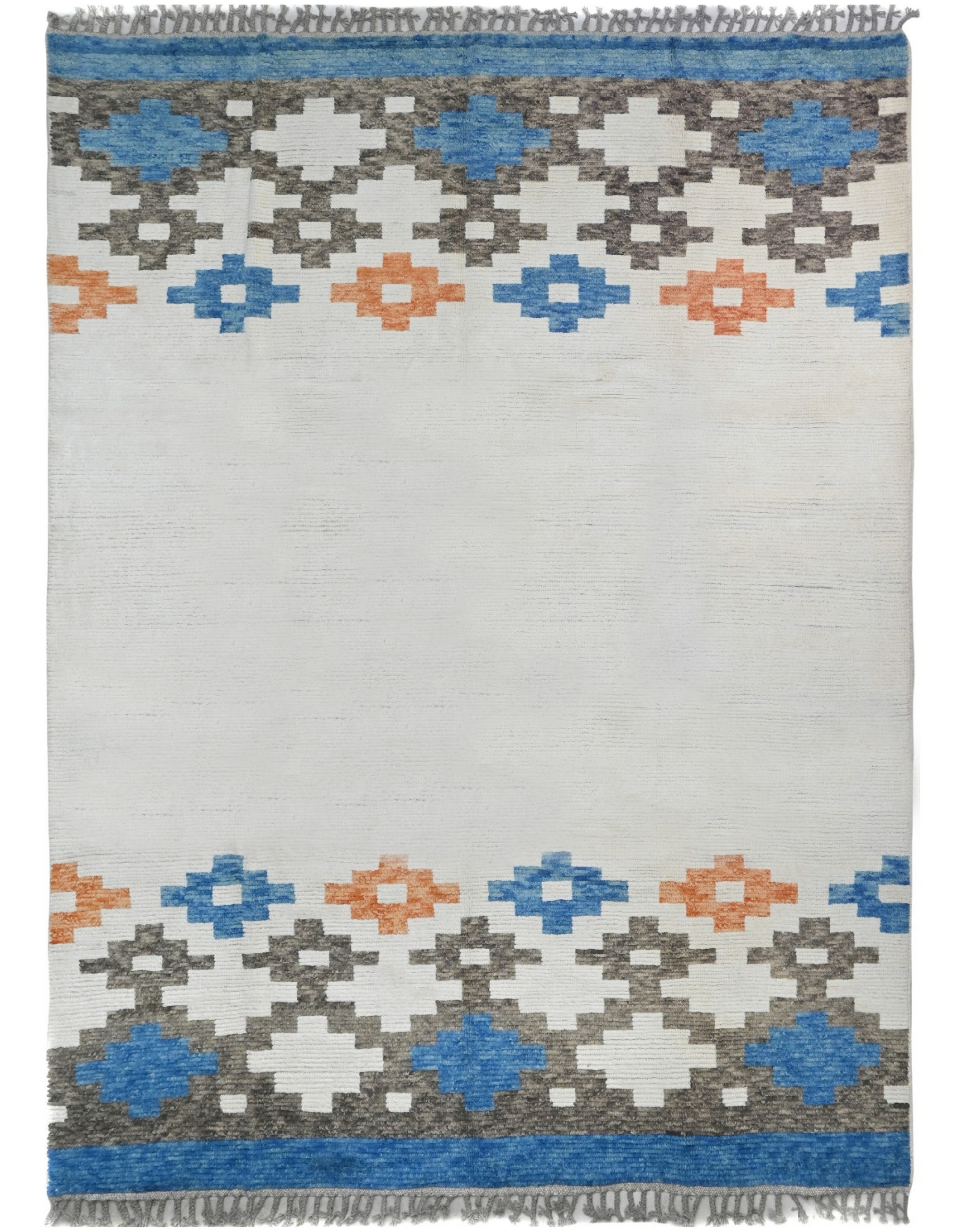 This hand-knotted wool rug from Pakistan offers a bold, graphic design. It features large, abstract motifs in a warm orange color that stand out against a rich blue field, all framed by a wide, textured orange border. This piece is a modern masterpiece that creates a striking visual impact in any space.