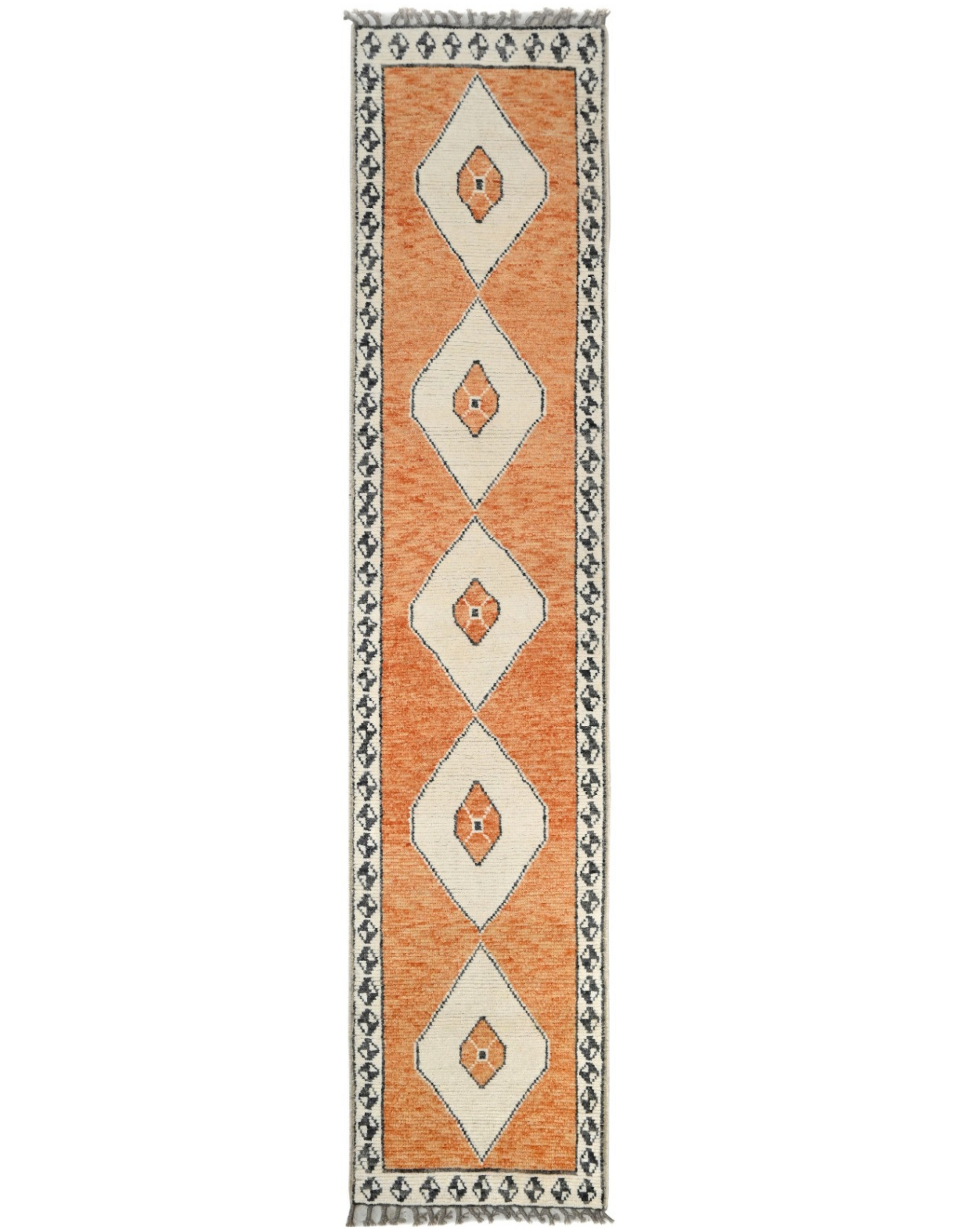 This hand-knotted wool runner from Pakistan features a modern geometric diamond design. It showcases a repeating pattern of large, off-white diamonds set against a vibrant orange background. The diamonds are framed by a thin black line, and the central diamonds each contain a small, black geometric shape. A detailed border with a repeating black and white pattern runs along both sides of the runner, adding an extra layer of design. This durable piece is a versatile foundation that adds a modern and eye-catching element to any hallway or entryway.