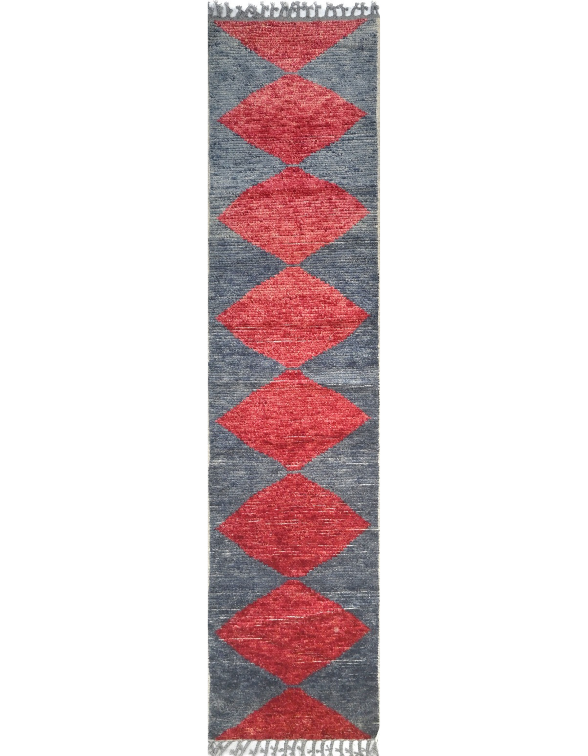 This hand-knotted wool runner from Pakistan features a bold, geometric diamond pattern. The rug is a deep charcoal gray that creates a striking backdrop for the repeating, large diamond shapes in a rich, textured red. The high-contrast design makes this runner a powerful accent piece, perfect for hallways or entryways. This durable piece is a versatile foundation that adds a modern and eye-catching element to any space.