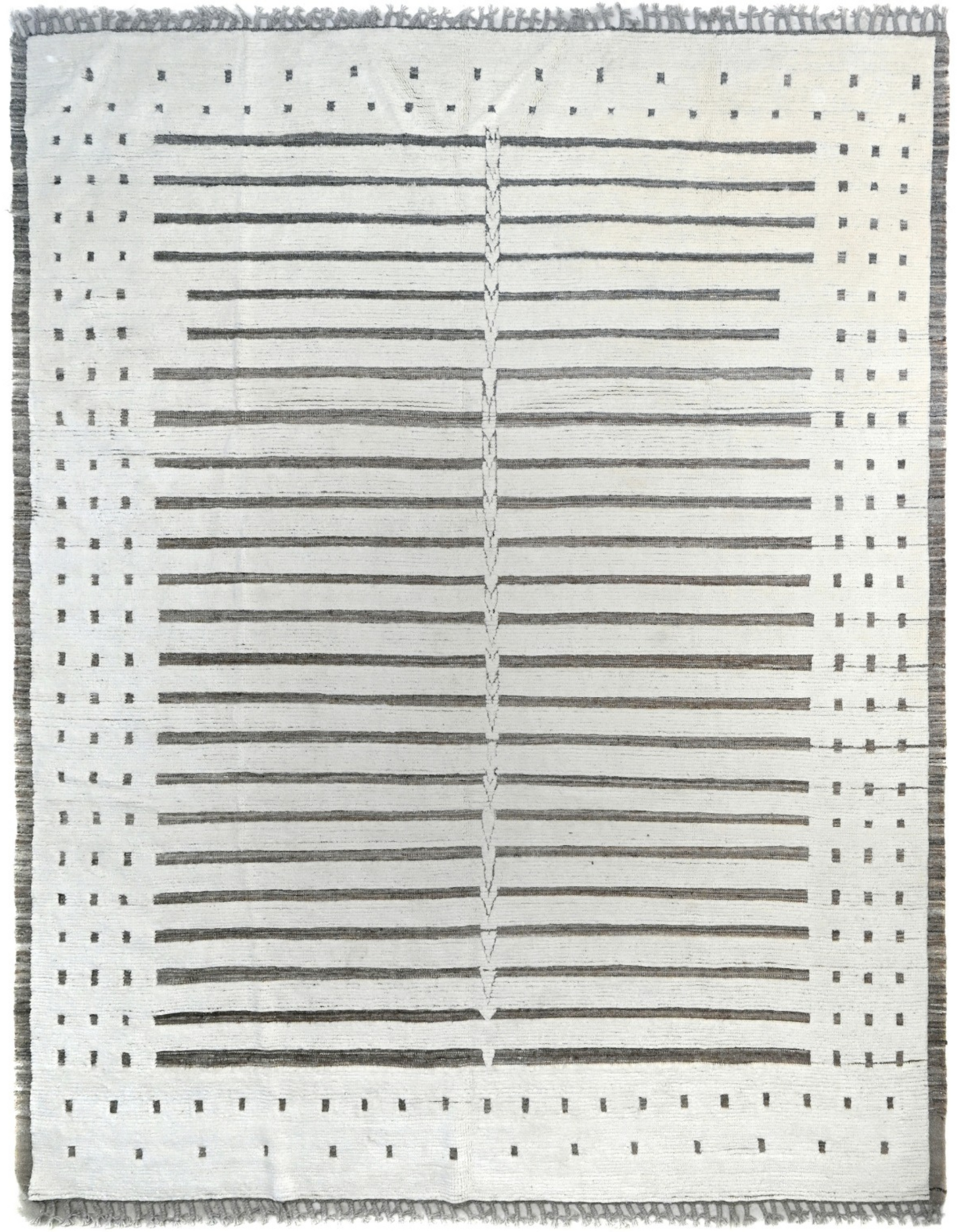 This hand-knotted wool rug from Pakistan offers a clean, architectural design. It features a prominent central field of horizontal gray lines that transition to a textured line pattern, all framed by vertical rows of small squares. This piece adds a layer of bold, graphic style and durable comfort to any space.