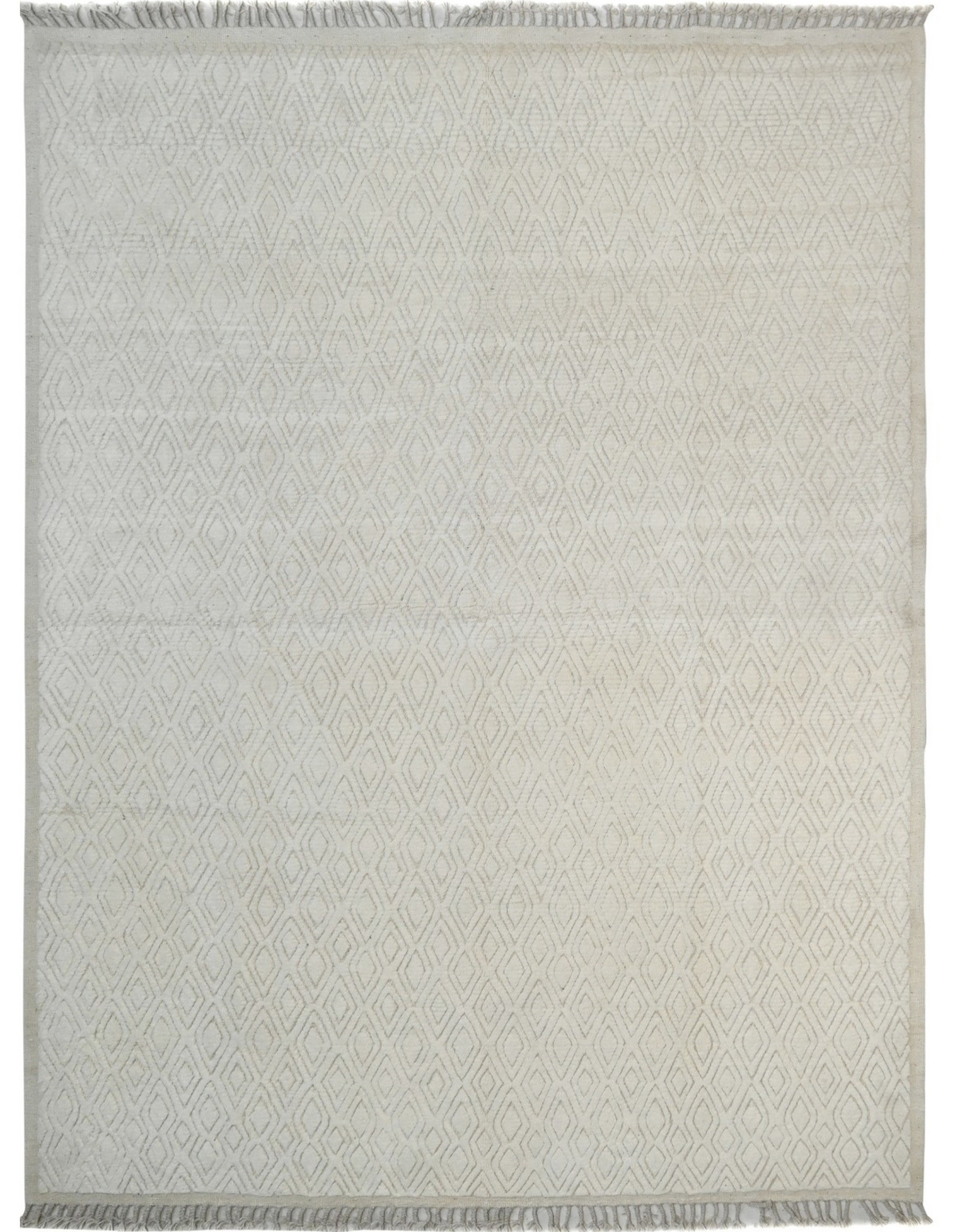 This hand-knotted wool rug from Pakistan features a modern, all-over pattern with a rich texture. It displays a dense, repeating geometric motif of small, interconnected diamond shapes. The design is rendered in a soft off-white color, creating a subtle, tonal look. This durable piece provides a versatile and clean foundation for a variety of decor styles, adding texture and sophistication without overwhelming a space.