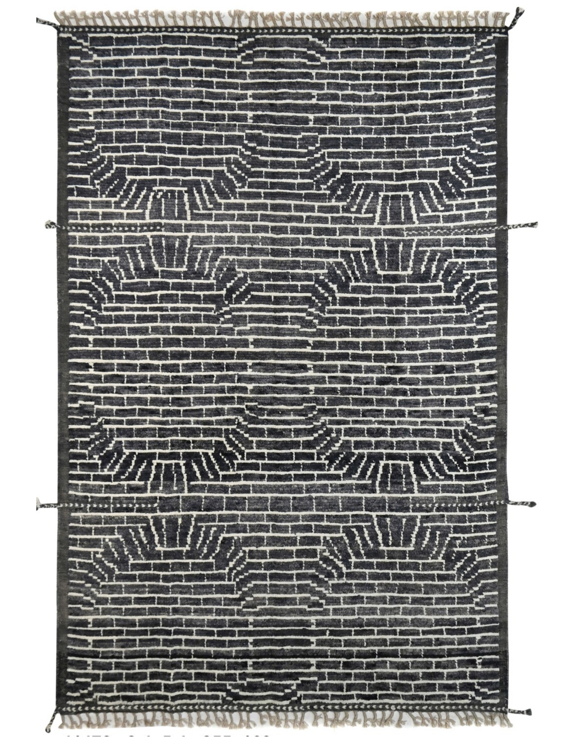This hand-knotted wool rug from Pakistan brings a bold, geometric design to any room. A striking column of stacked off-white diamonds contrasts beautifully against a textured gray background, creating a dynamic and modern focal point. Crafted with meticulous detail, this piece is made to be both visually compelling and durable