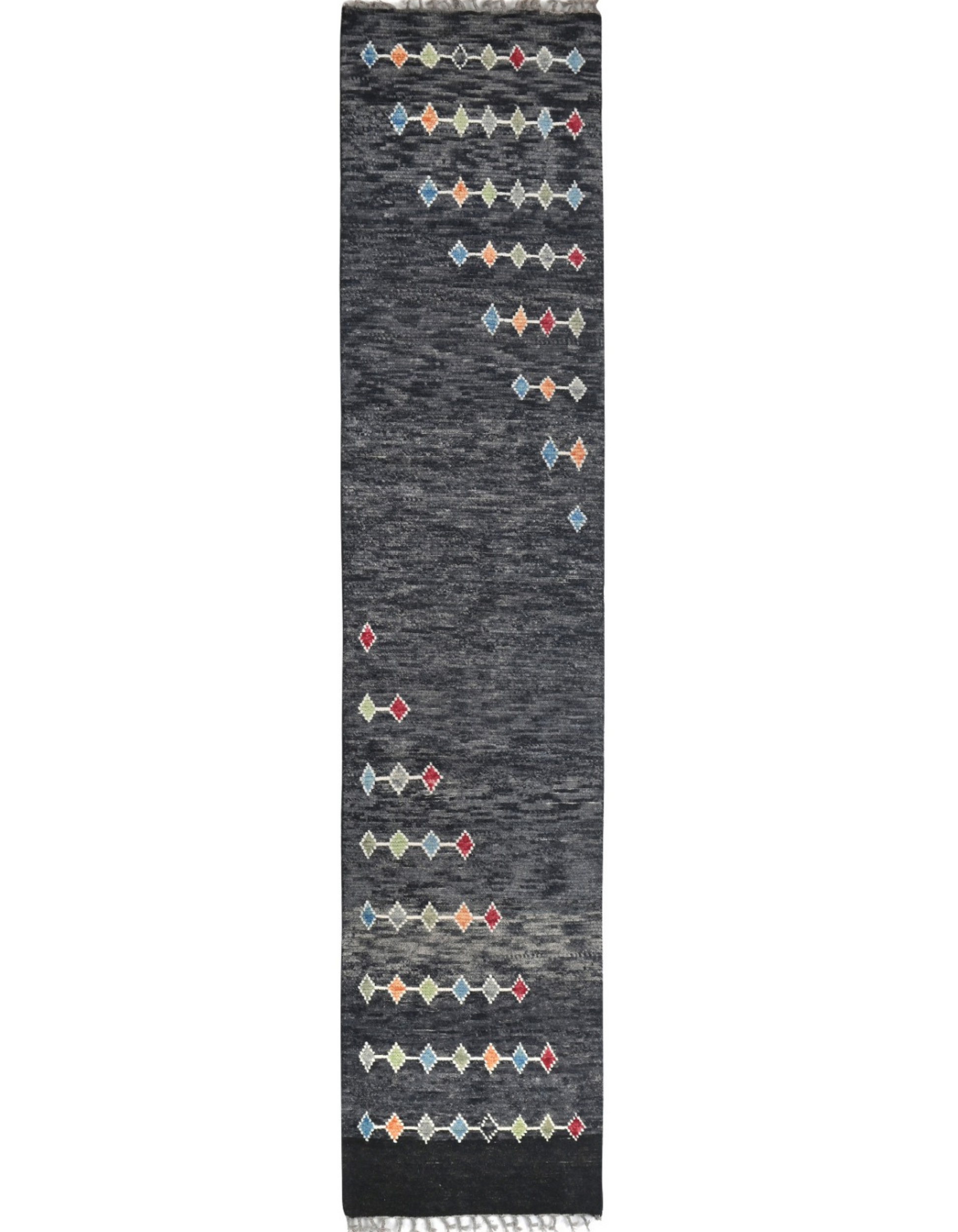 This hand-knotted wool runner from Pakistan features a modern geometric pattern with a playful, scattered feel. A series of small, colorful diamonds are linked by thin off-white lines, creating a chain-like design that appears to float across the rug. The diamonds are a variety of vibrant colors, including red, orange, blue, and green, providing a striking contrast to the dark gray, textured field. This durable and eye-catching piece is perfect for adding a touch of modern style and color to a hallway or entryway.