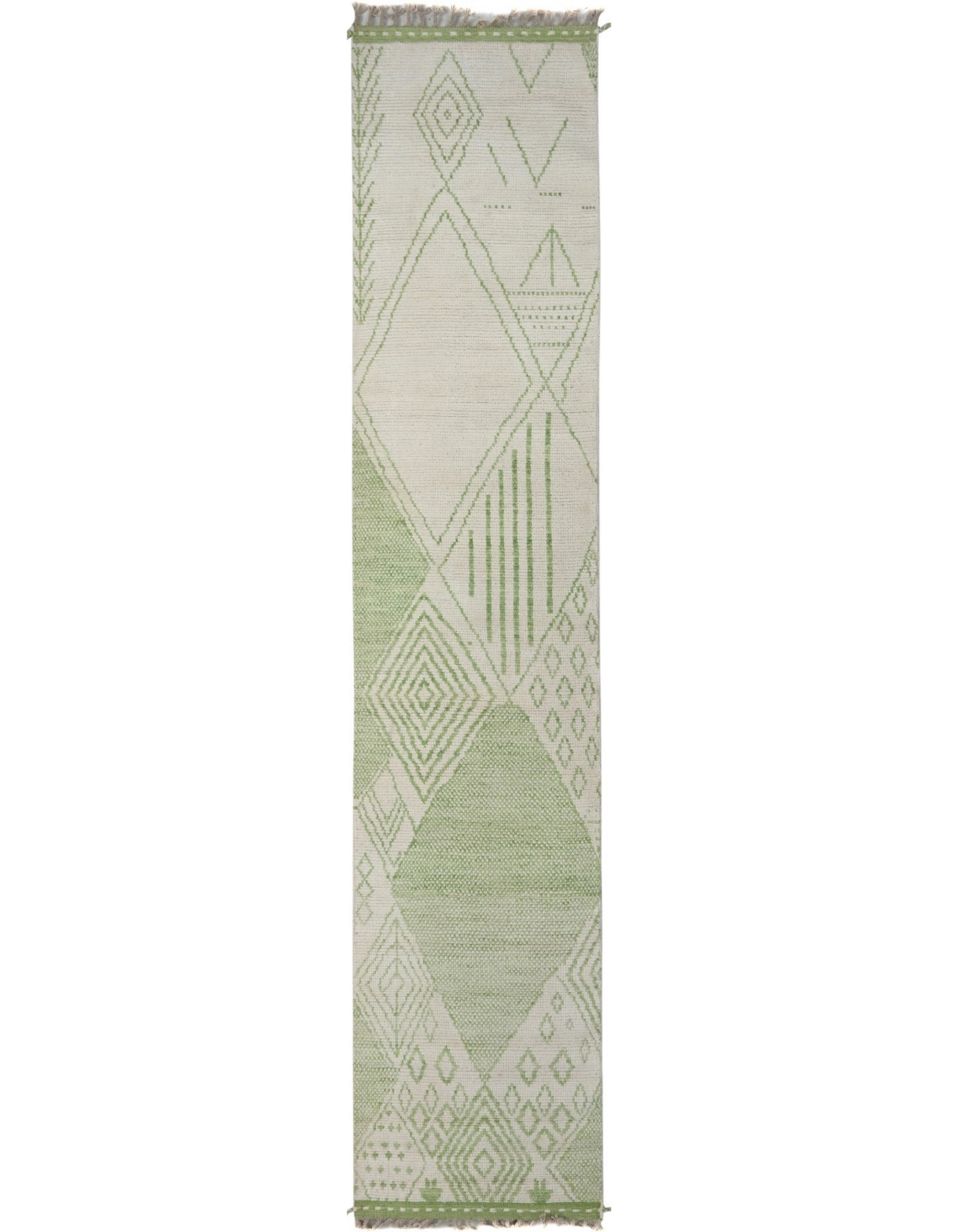 This hand-knotted wool runner from Pakistan features a modern, patchwork-style geometric design. The pattern is composed of various distinct blocks, each with a unique green motif against an off-white field. The blocks contain a mix of patterns, including repeating diamonds, solid green sections, and vertical stripes. The varied designs and textures create a dynamic and visually interesting look. This durable piece adds a modern and artistic element to any hallway or entryway.