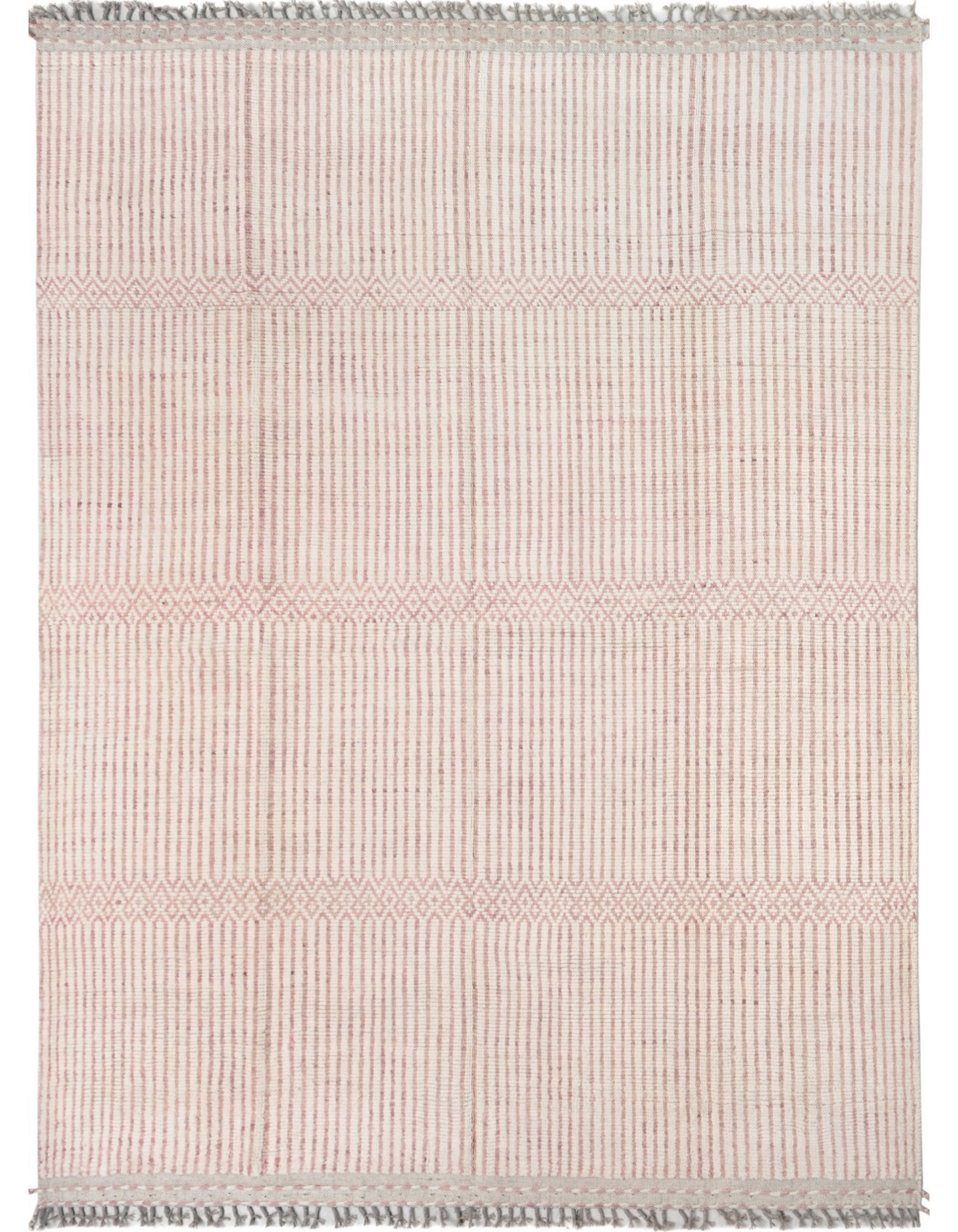 This hand-knotted wool rug from Pakistan offers a soft, modern design. It features a continuous pattern of subtle vertical pinstripes in a muted pinkish beige on a clean off-white background. This piece is a versatile and durable addition that provides a quiet, calming foundation for your space.