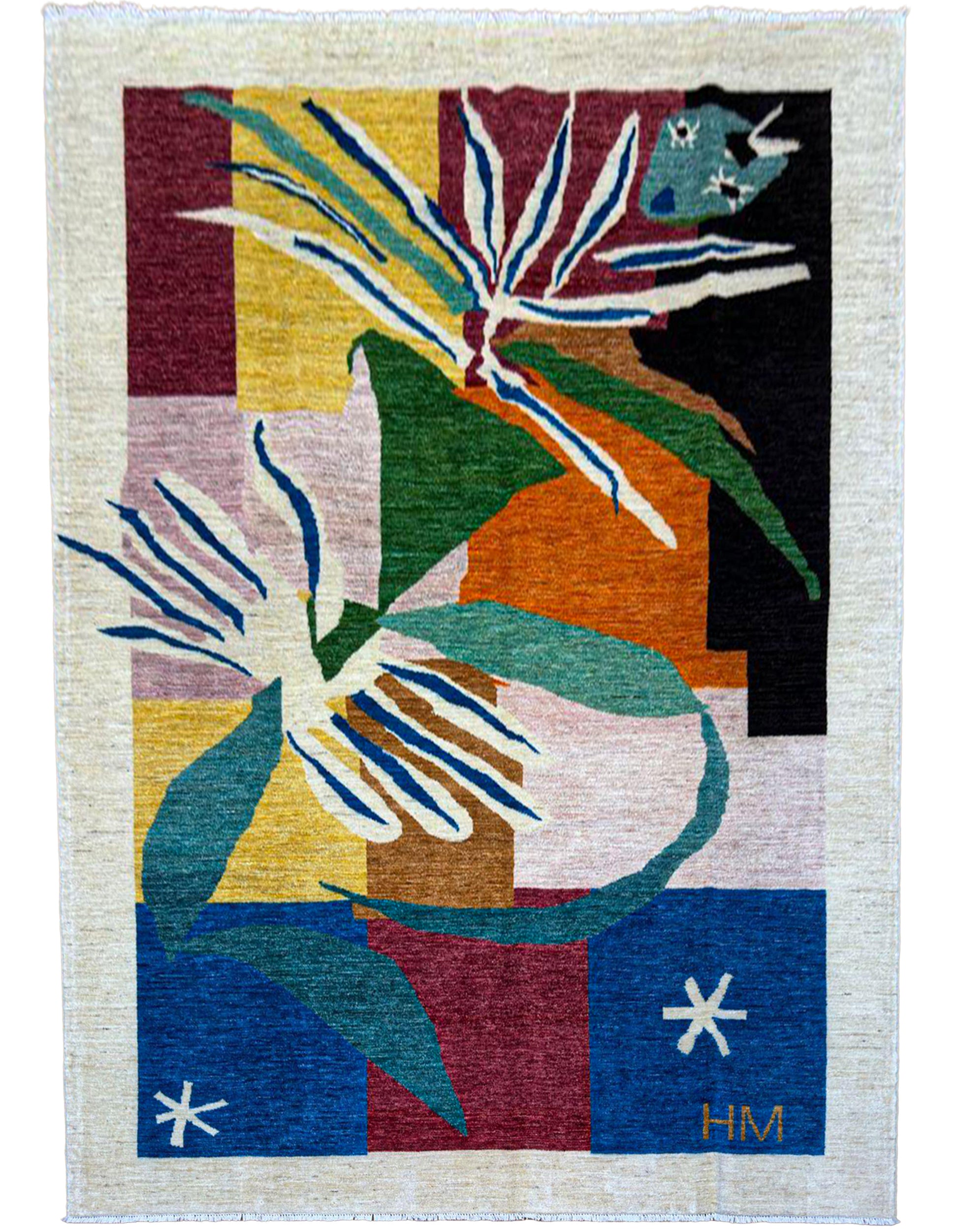 This hand-knotted wool rug from Pakistan features a bold, modern, and abstract design with a unique patchwork style. The rug's surface is divided into blocks of various colors, including brown, green, yellow, blue, and black. A large, abstract floral or plant motif in white and blue with a long, curving stem winds across the rug, tying the different colored blocks together. This artistic and durable piece adds a touch of modern, graphic style and a pop of color to any room.